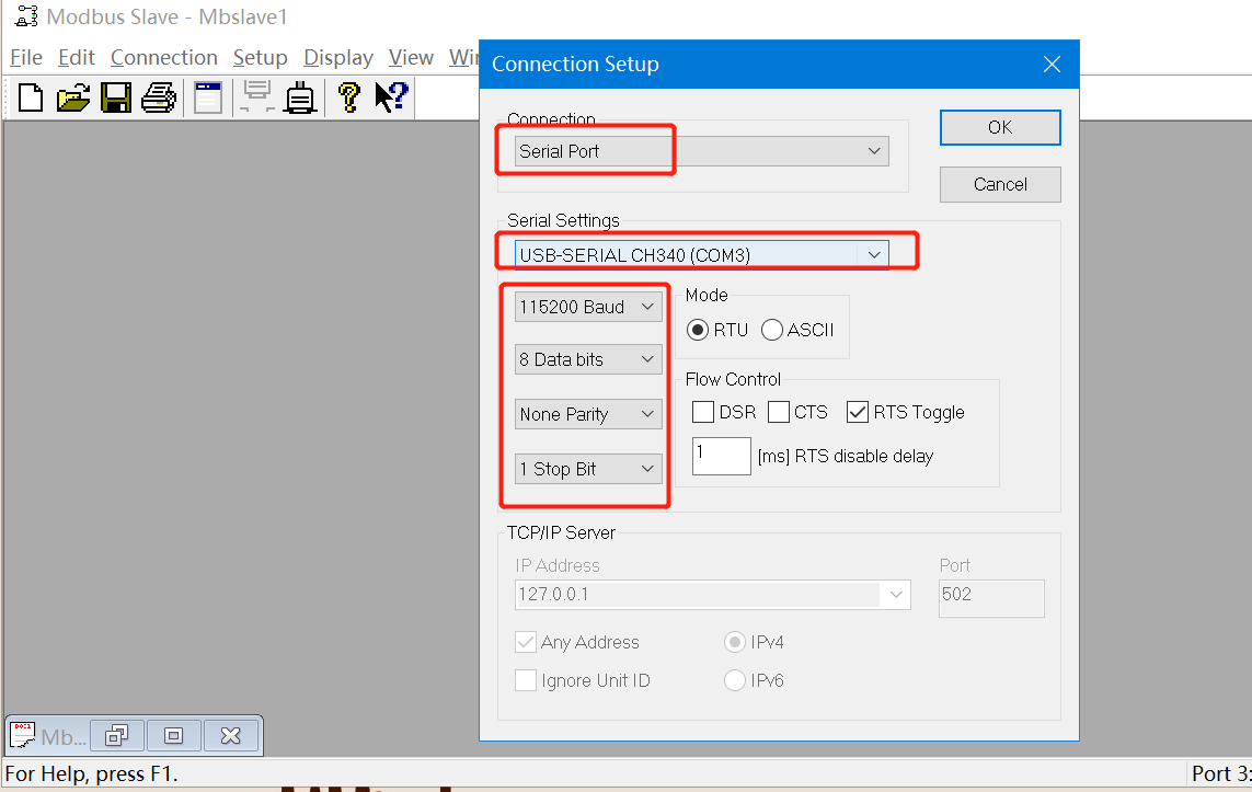 8.打開modbus slave軟件,選擇好相應的com3口和串口參數,并賦予slave值。