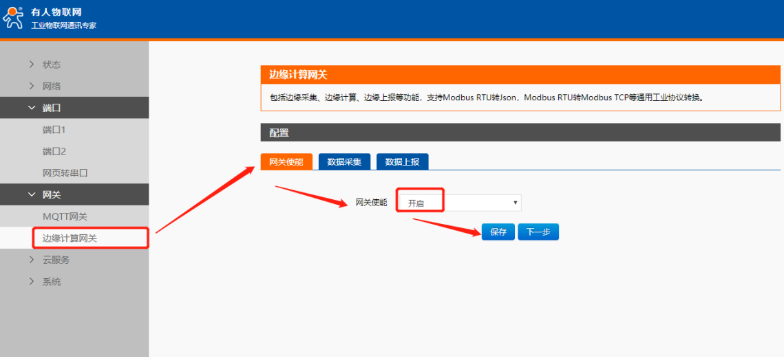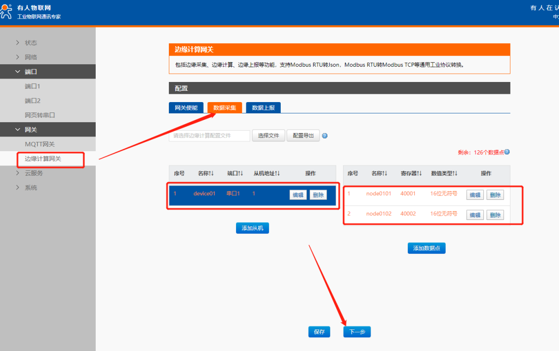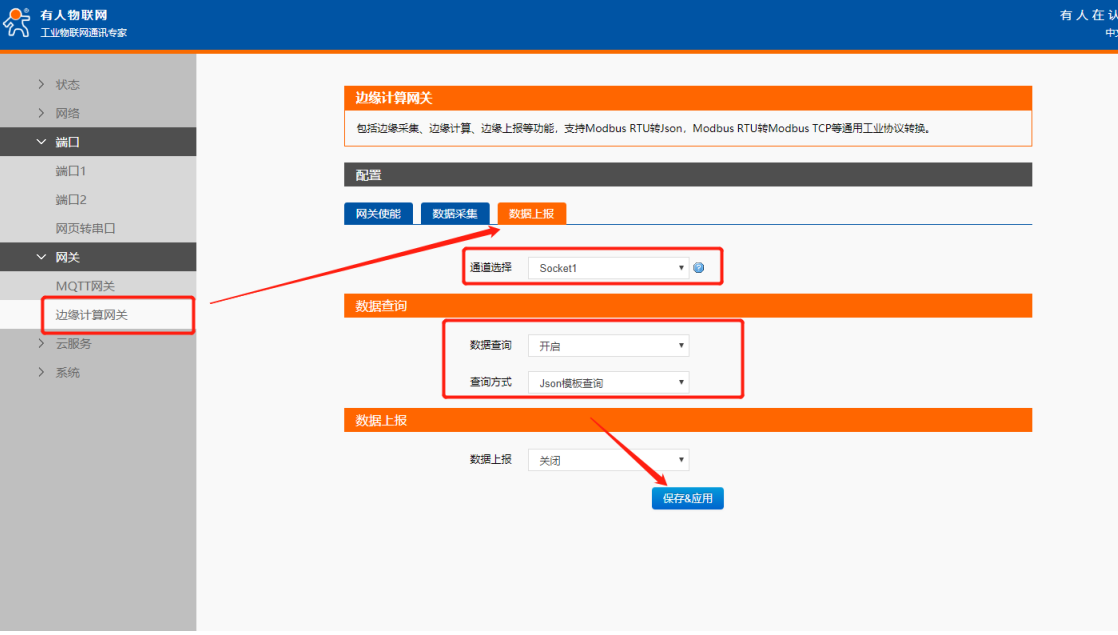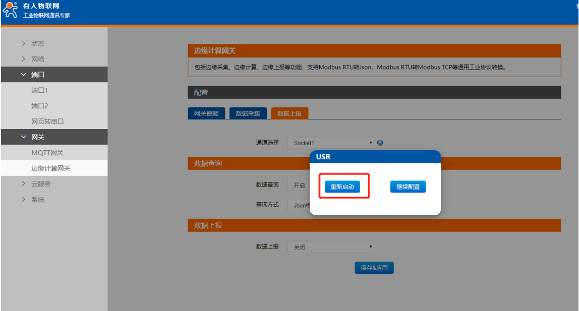 6.點擊開啟邊緣計算網關模式的使能,添加好要讀取的從機和數據點,通道選擇socket 1,開啟數據查詢功能,查詢方式選擇Json模板查詢,最后點擊保存重啟。