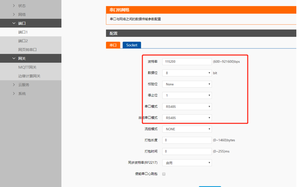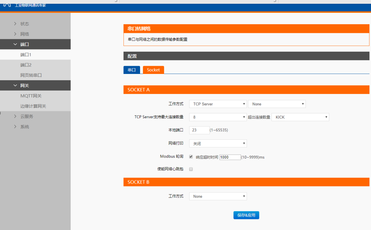 5.設置端口1的串口參數,要跟485設備參數保持一致;工作方式選擇 Tcp Server,本地端口23
