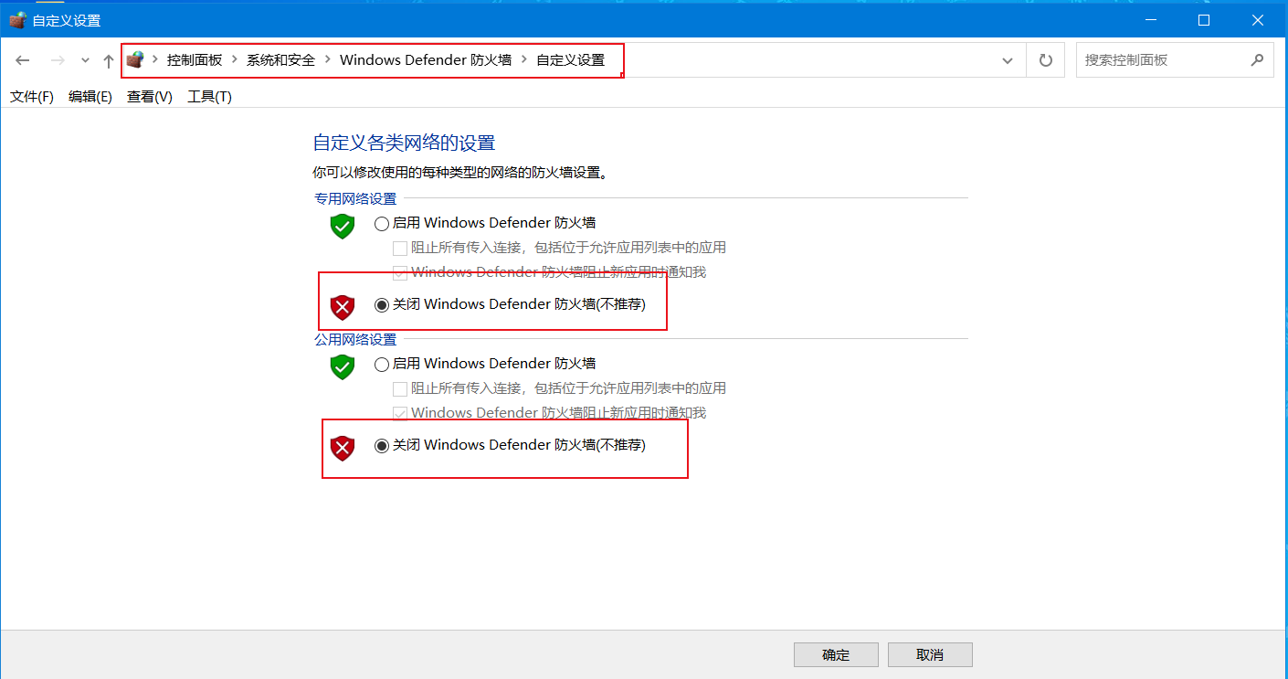 2.按路徑:控制面板--網絡和Internet---網絡和共享中心找到“windows防火墻”和“更改適配器設置”選項,關閉防火墻并禁用與本次測試無關的網卡,并關閉電腦殺毒軟件。