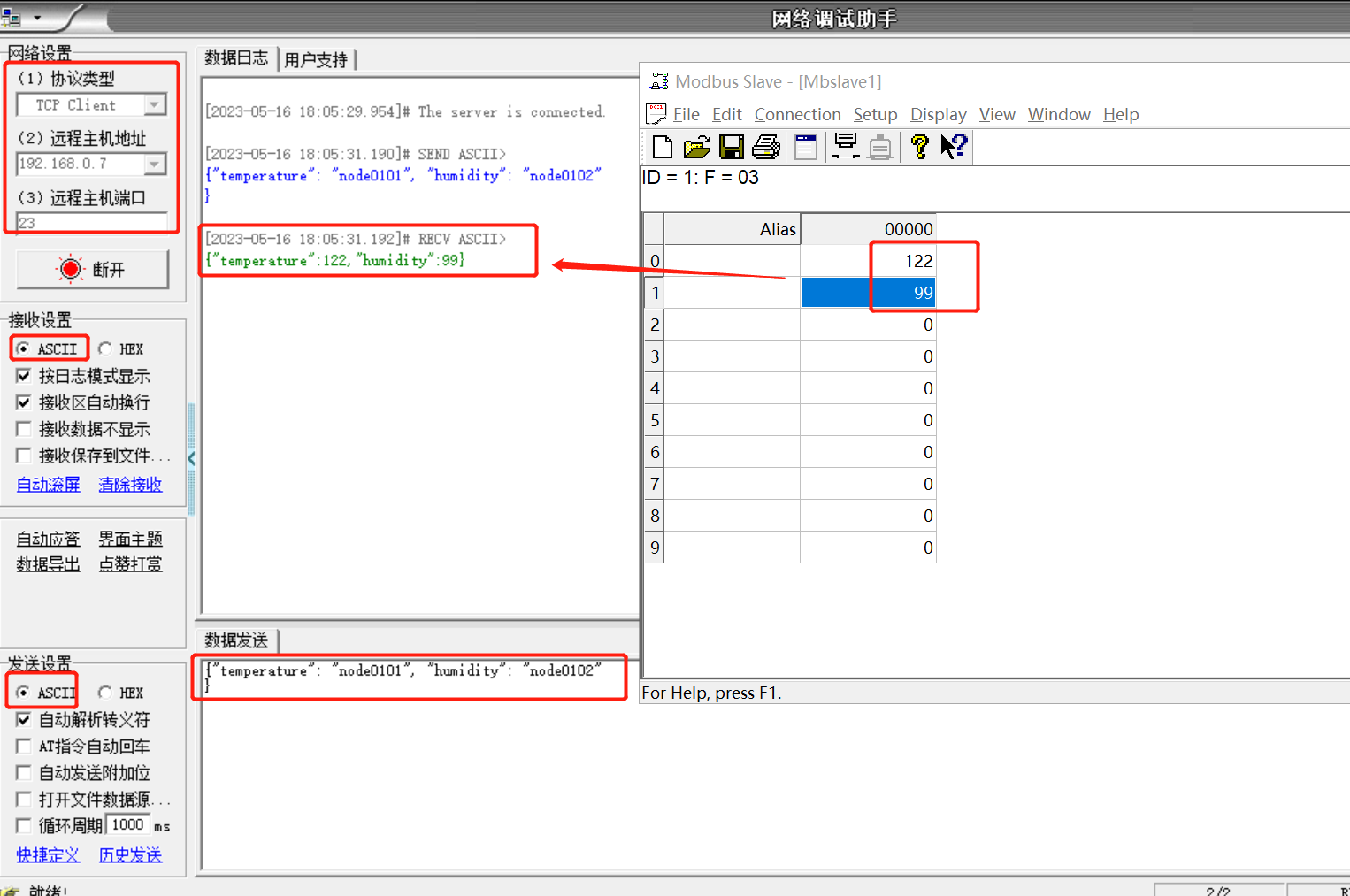 打開網絡調試助手,選擇 tcp client,遠程ip和端口分別對應了N520的ip和本地端口。