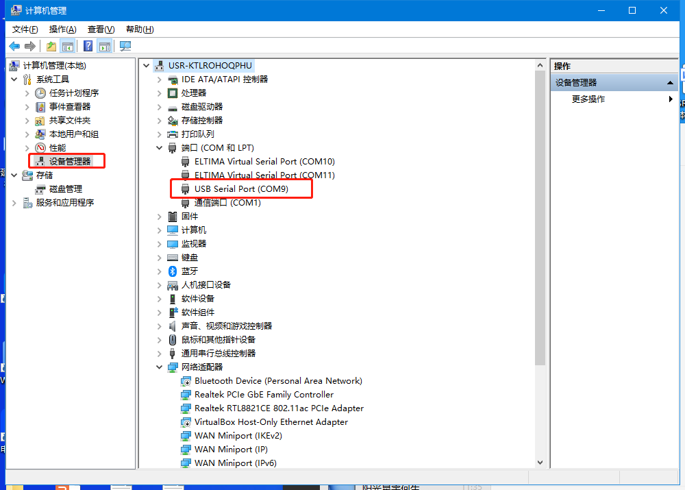 找到設備管理器,點擊端口,確認USB-RS232串口線的COM口號,有人的測試電腦是COM9