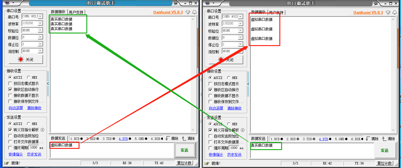 測試兩個串口之間的數據傳輸,就是T1真實串口和虛擬串口之間的數據傳輸。