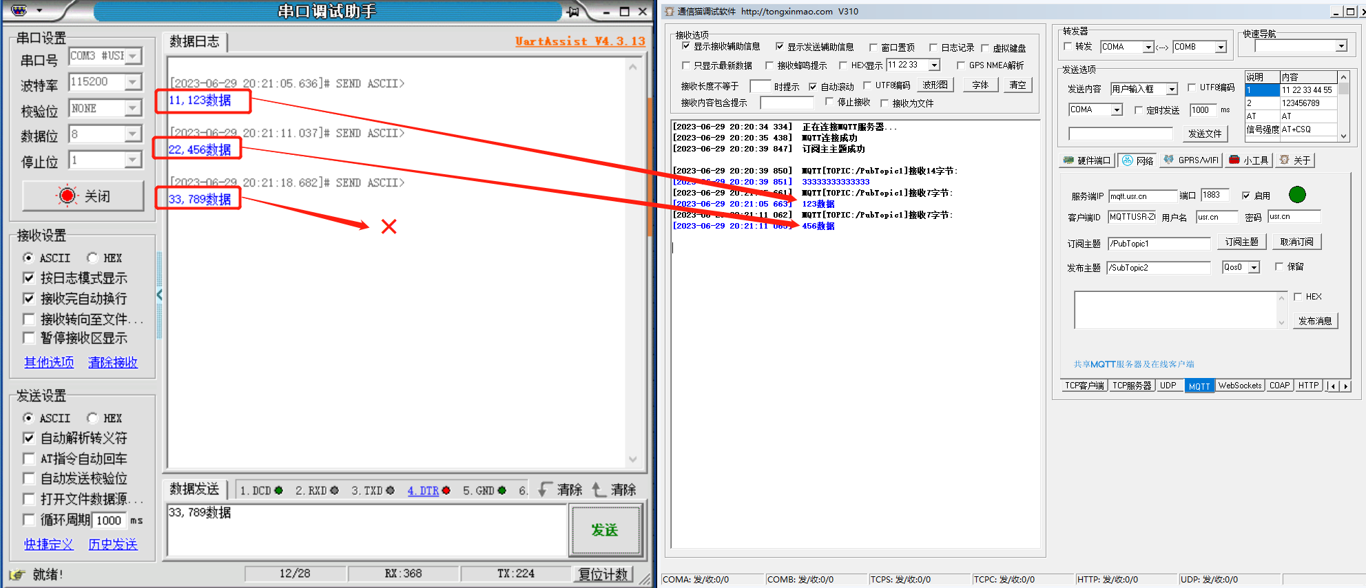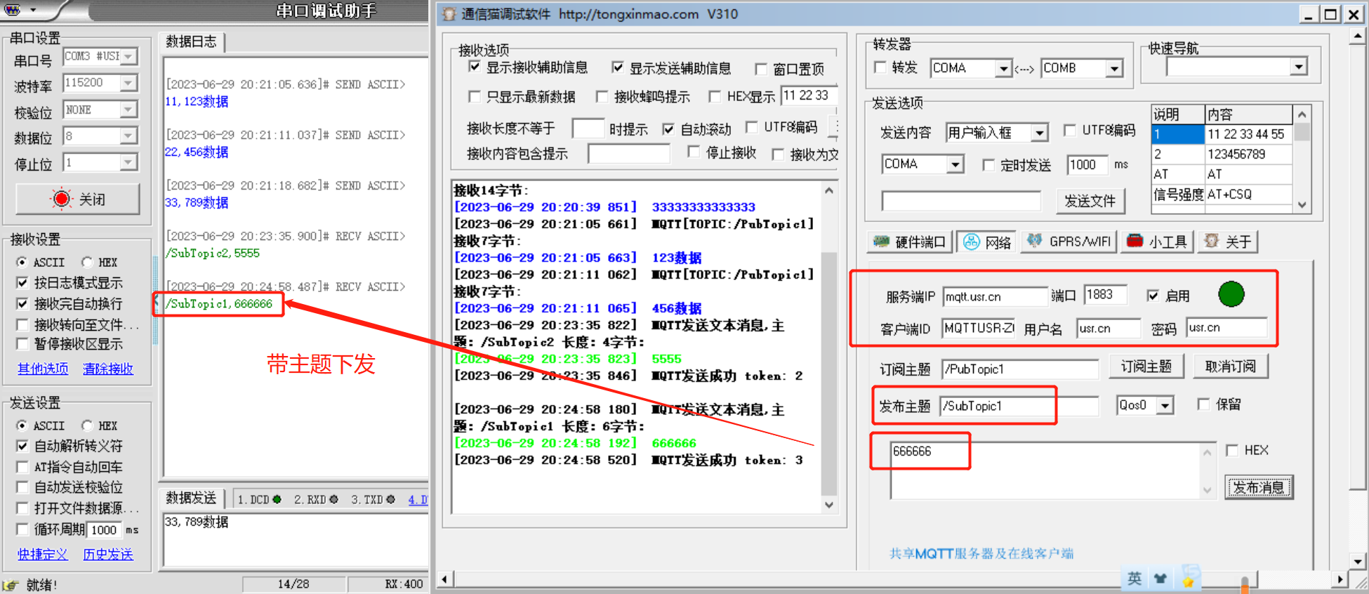例如:發布主題開啟多主題分發,主題標識設置為 11,串口發送 11,123數據,數據將發送到MQTT客戶端軟件上。如果串口發送 33,789數據,則數據將會被丟棄,因為沒有主題名稱標識為 33 的主題