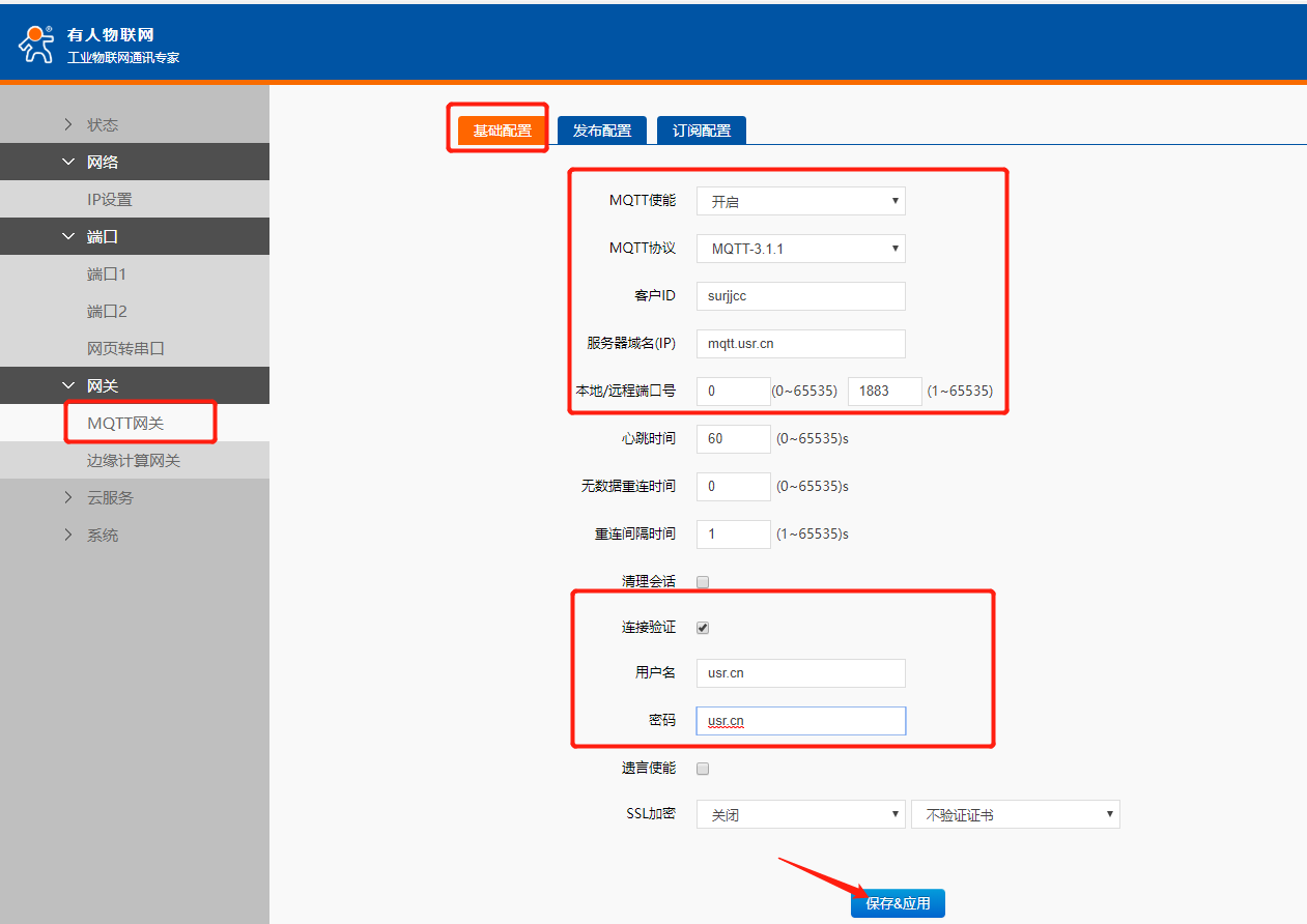 4、開啟MQTT使能,配置MQTT服務器參數,并配置發布主題和訂閱主題,注意:主題名稱設置不同。