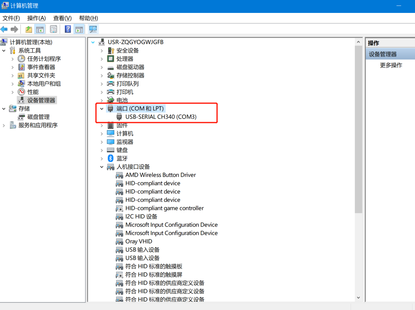 2、檢查USR-RS485串口線的COM口號,點擊電腦計算機,右擊鼠標,點擊設備管理器,查看端口,確認USB-RS485串口線的COM口號,有人測試電腦是COM3。