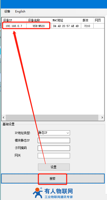 3、電腦和N520在同局域網內,可以用設置軟件搜索到N520設備。修改N520的串口參數跟485設備保持一致。