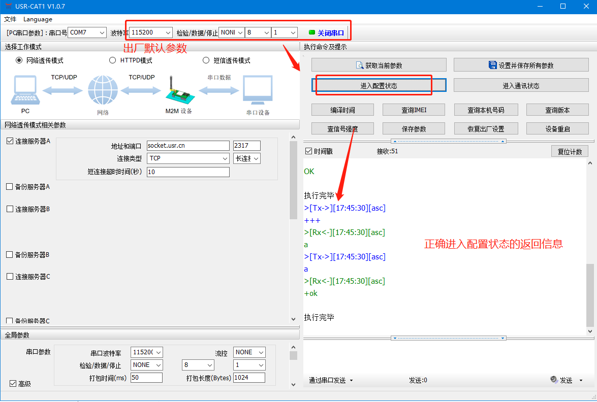 1、使用設置軟件打開串口、進入配置狀態,返回下圖信息表明正確進入配置狀態