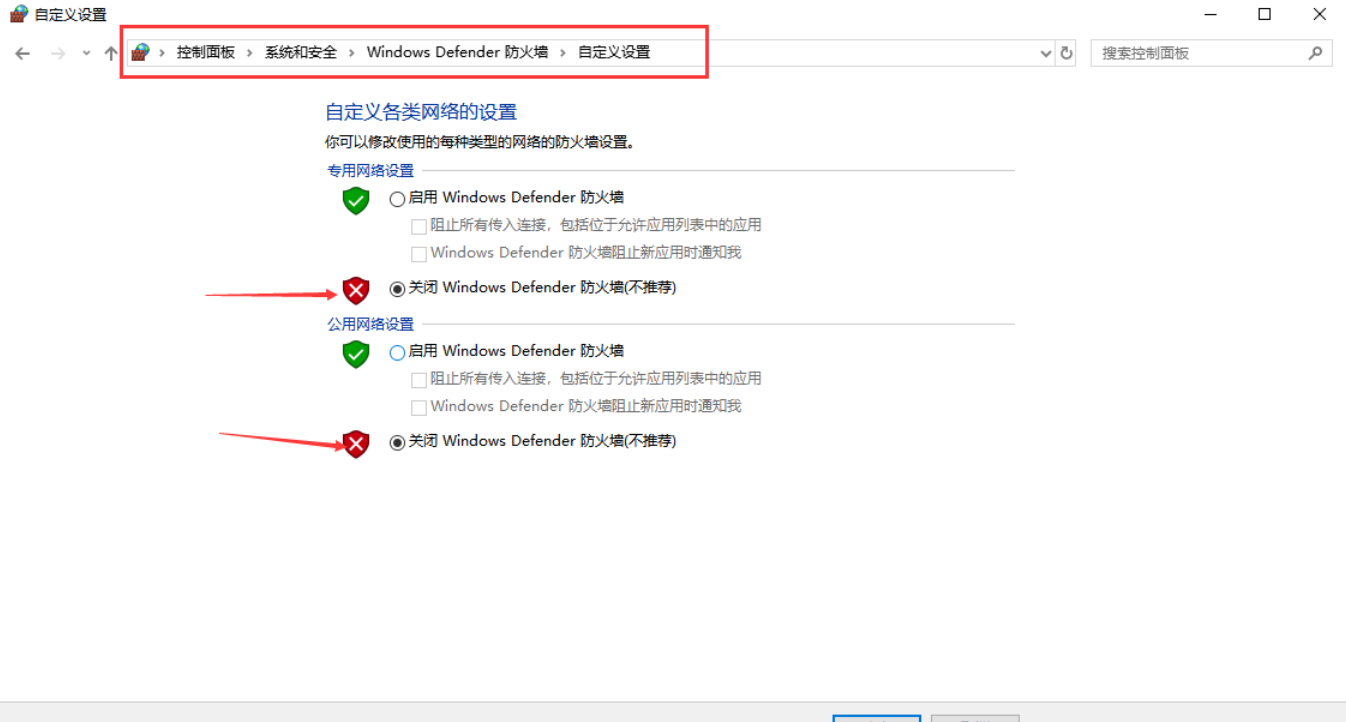 1、設置路徑:控制面板--->網絡和Internet--->網絡和共享中心找到“windows防火墻”和“更改適配器設置”選項,關閉防火墻并禁用與本次測試無關的網卡。并關閉電腦殺毒軟件。