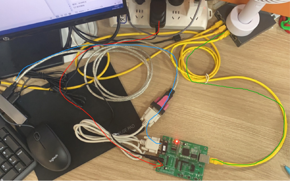 把USR-TCP232-ED2模塊放到評估板上,用232轉usb串口線連接電腦,網口直連電腦,檢測硬件連接無錯誤后,接入我們配送的電源適配器,給ED2模塊供電。