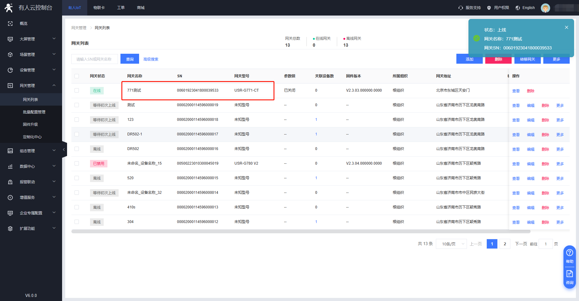 在網關管理---網關列表可以看到我們掃碼添加的G771設備,如果設備目前處于離線狀態,可以檢查一下設備自身是否可以正常聯網。在設備正常聯網狀態下可以重啟下設備,可以看到設備的在線信息。