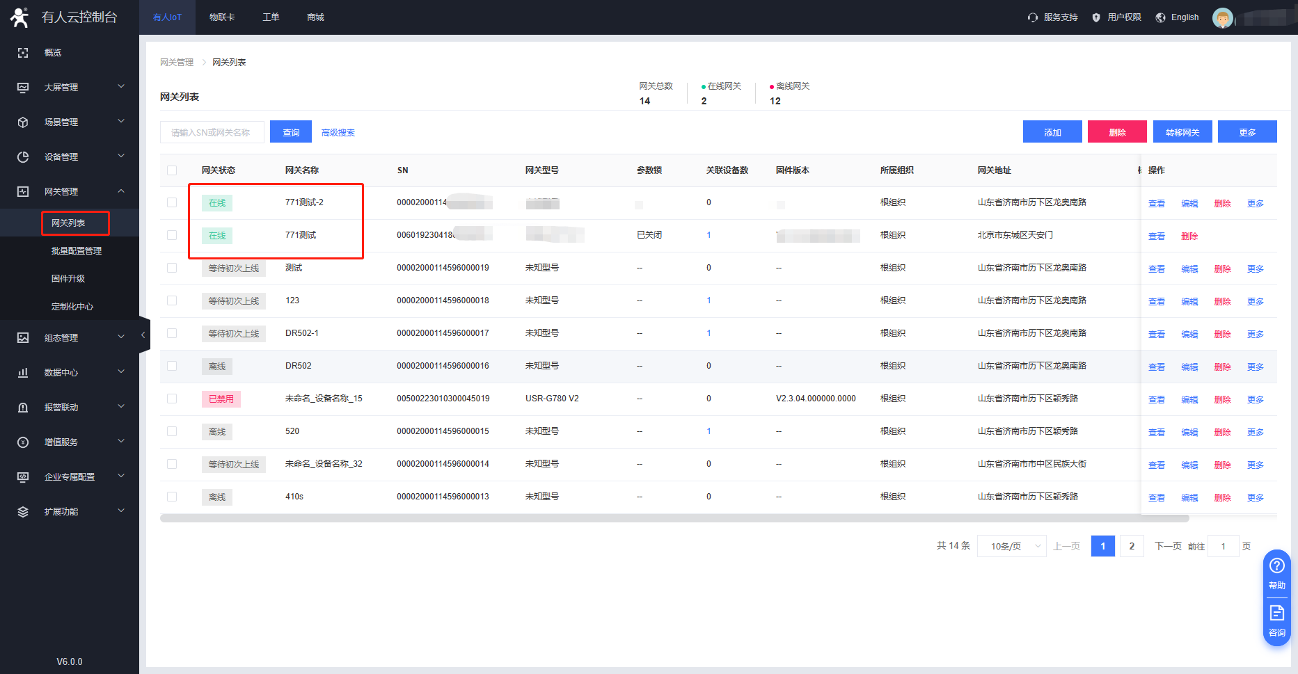 在網關管理---網關列表可以看到我們掃碼添加的兩臺G771設備,如果設備目前處于離線狀態,可以檢查一下設備自身是否可以正常聯網。在設備正常聯網狀態下可以重啟下設備,可以看到設備的在線信息。