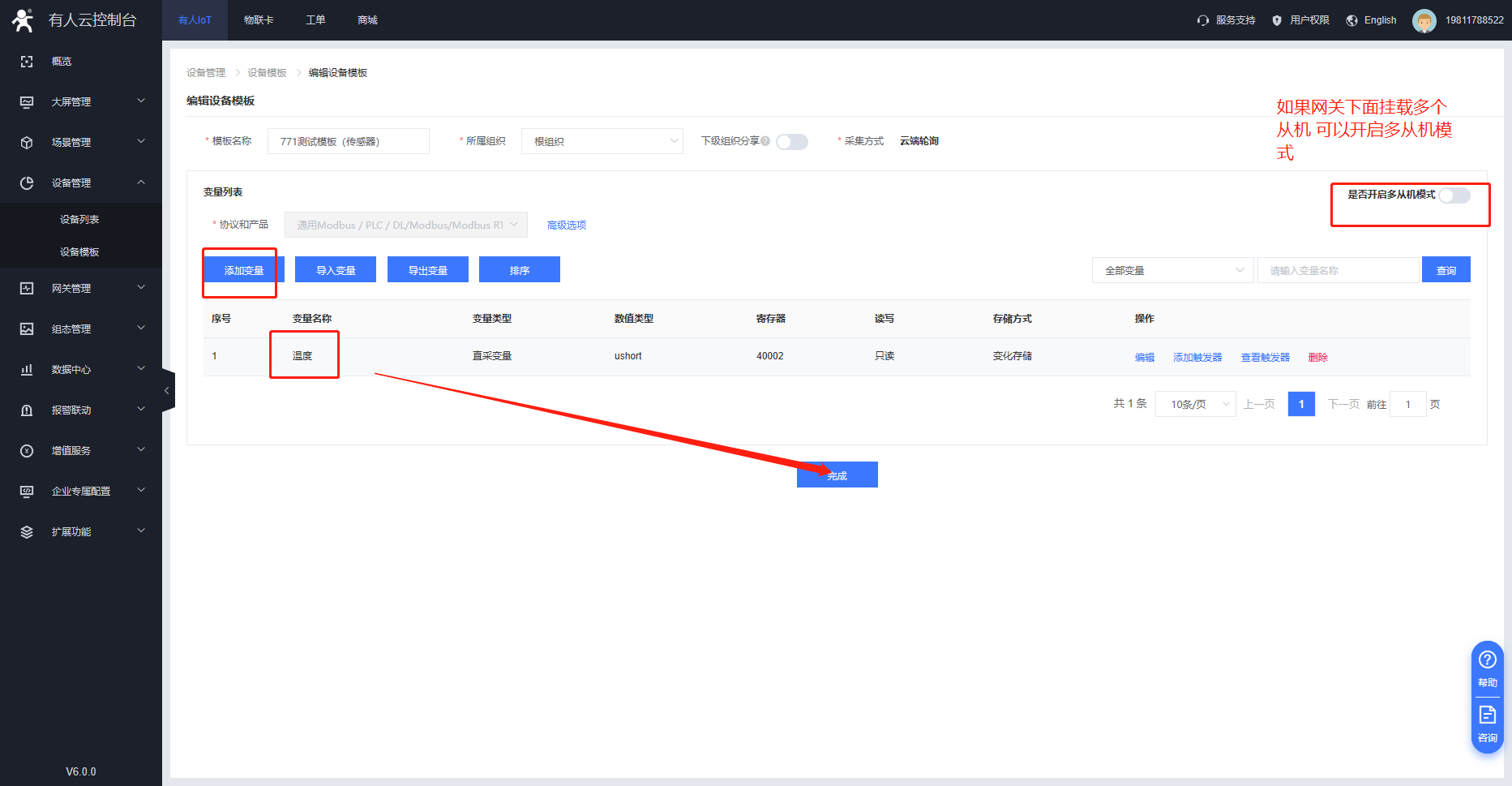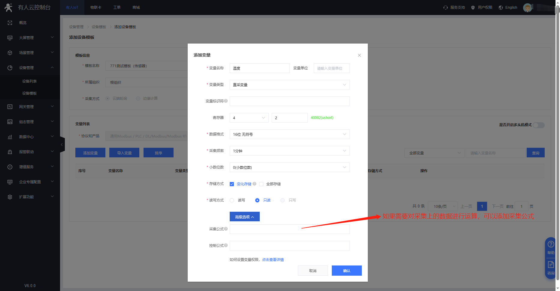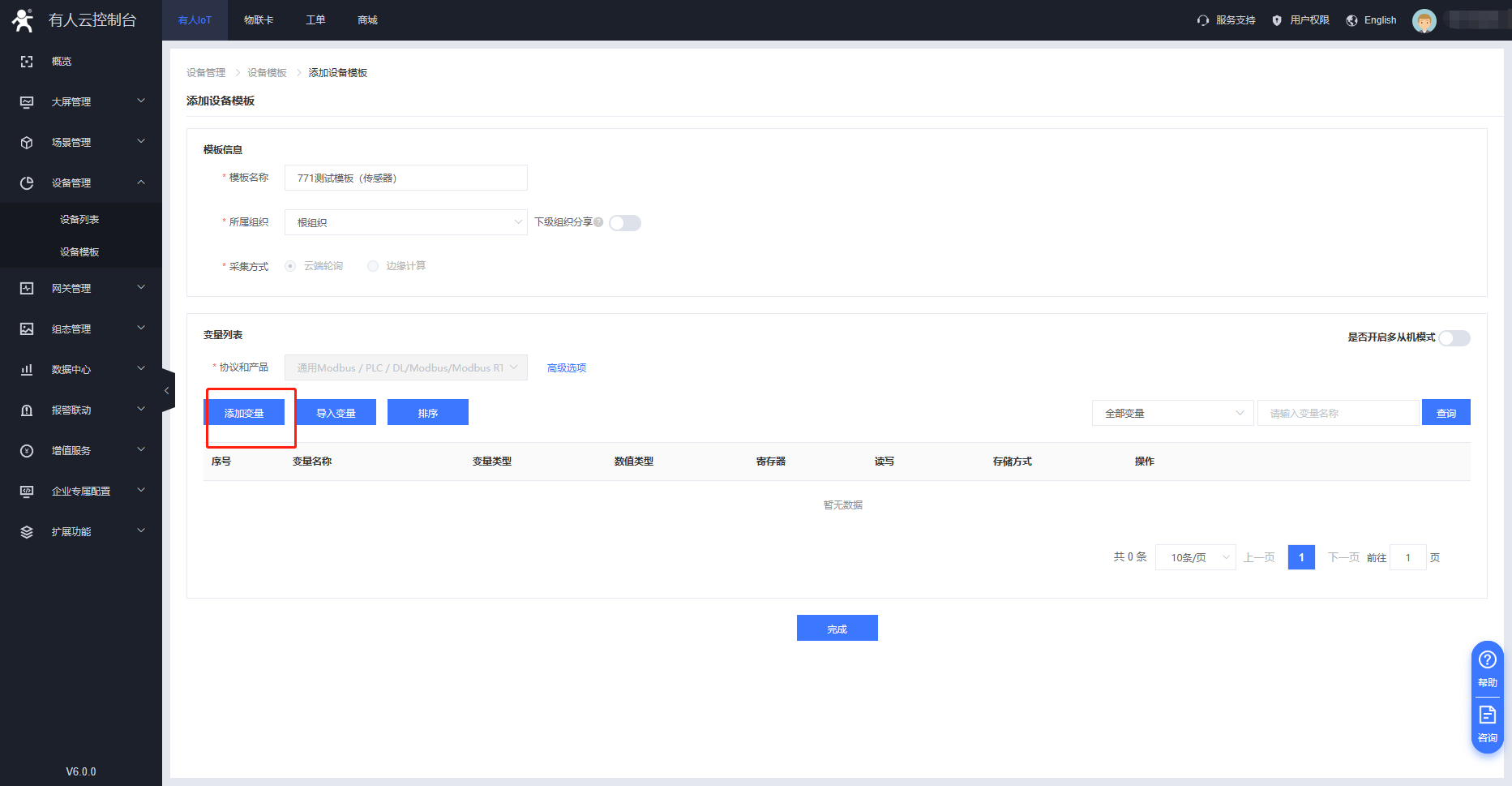 3、G771 支持modbus協議 云端輪詢方式。在設備管理---設備模板界面添加需要采集的變量點。寄存器信息需要與串口設備進行匹配。