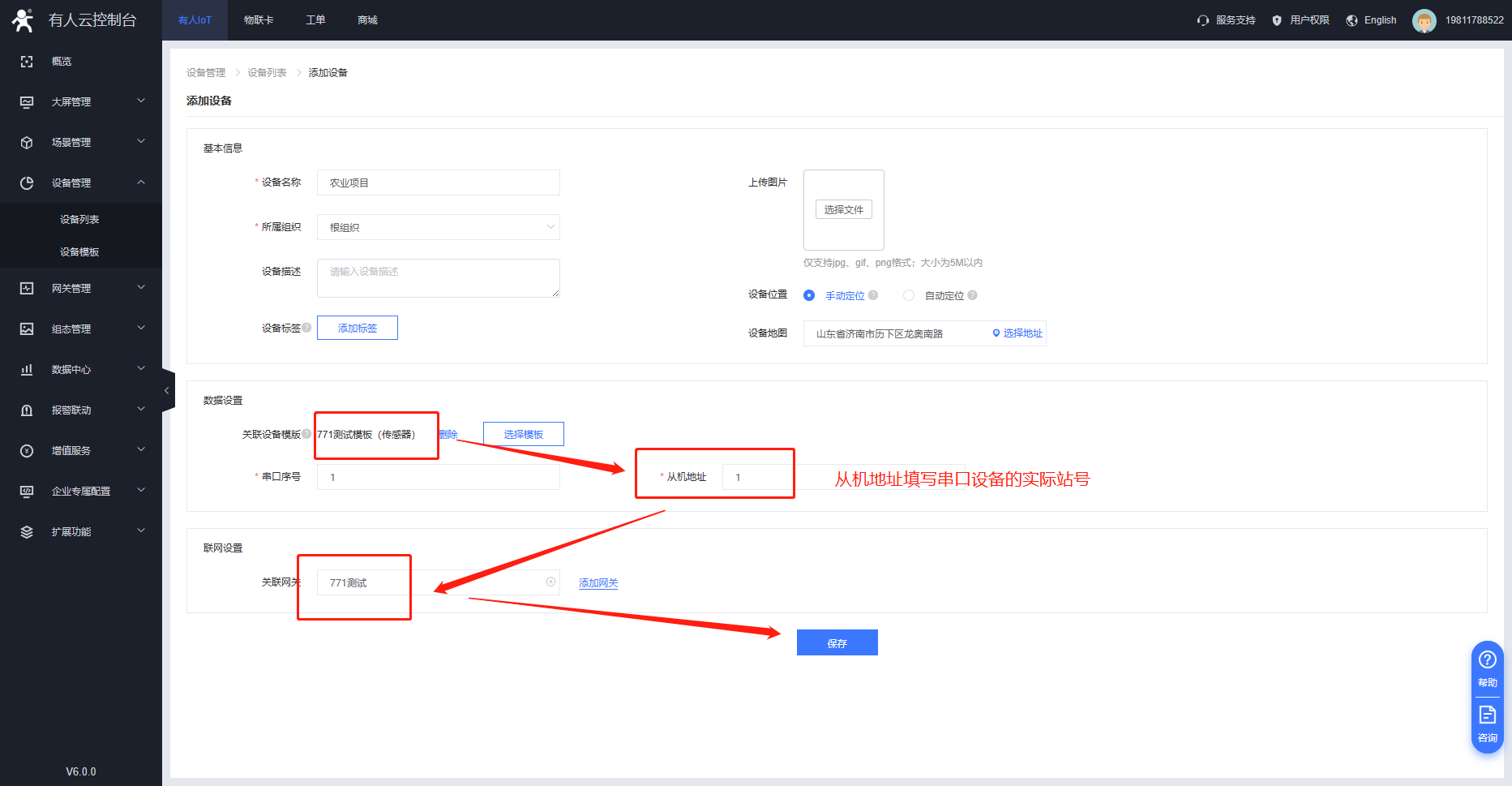 4、在設備管理--設備列表的界面將掃碼配置的網關以及設備模板進行關聯,并配置串口終端設備的從機地址。