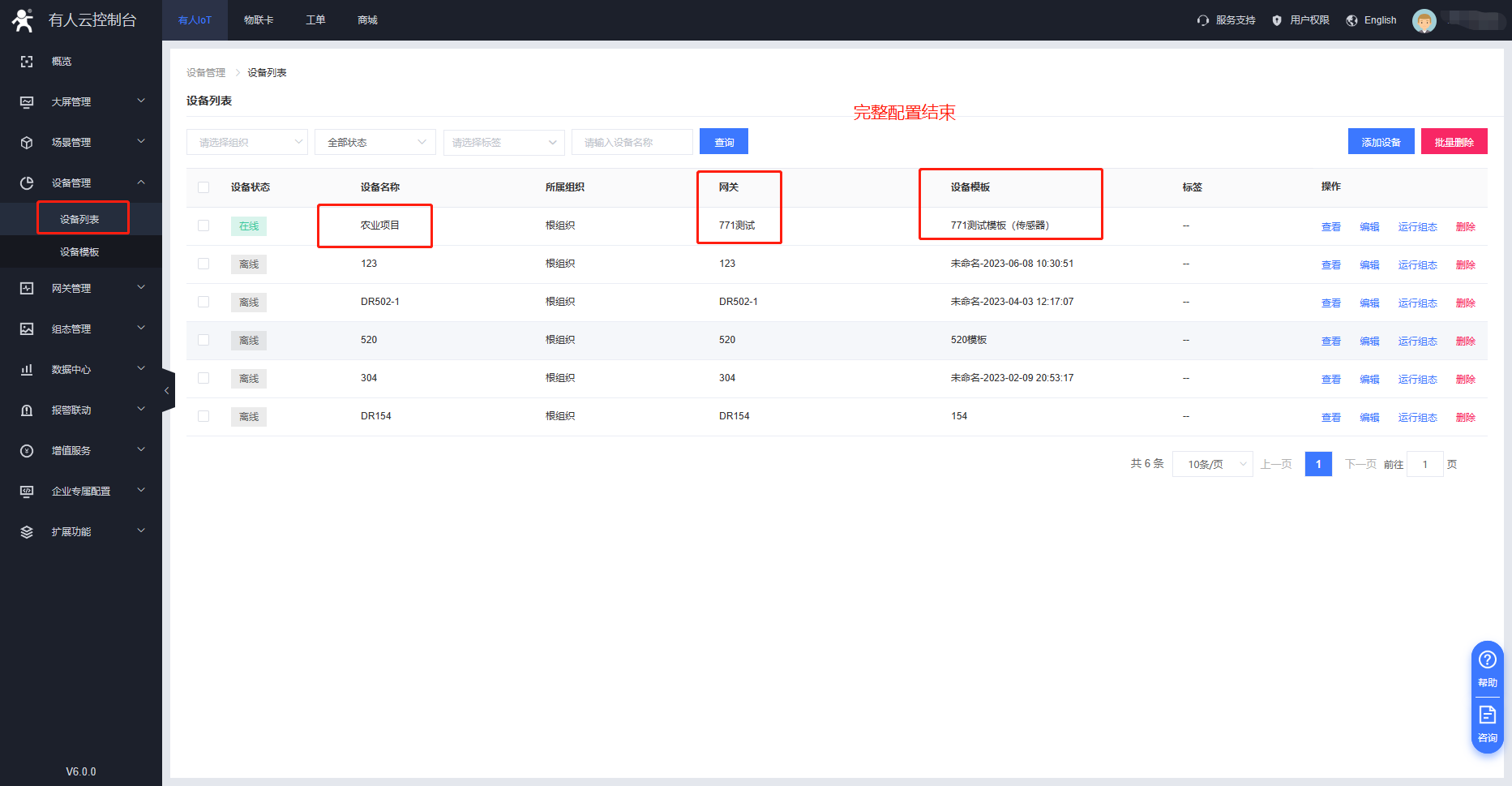 5、在設備列表信息展示界面,顯示關聯的網關與設備模板表示云端配置已完成