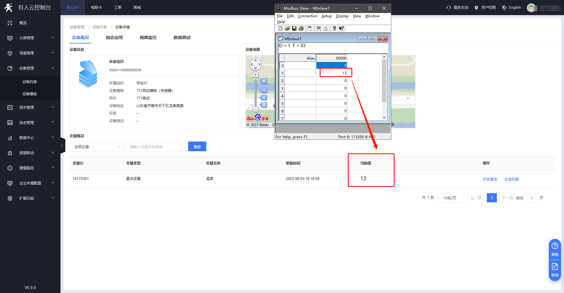 打開modbus slave軟件(模擬串口傳感器設備)配置串口設備的寄存器信息,調用電腦設備管理器中生成的端口。寄存器數值寫為13,云端將進行采集。