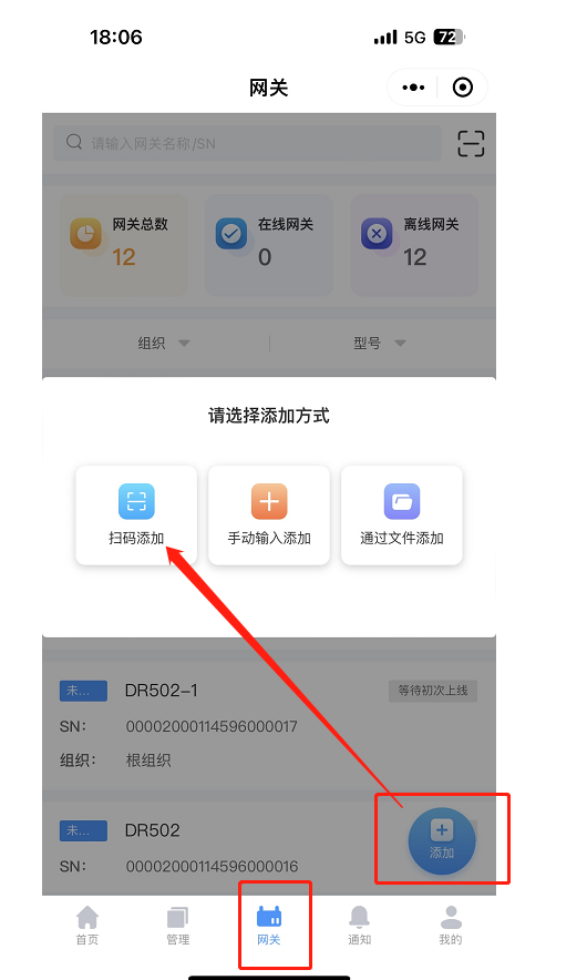 4、若批量購買網關設備,可以掃描紙質出貨單上方的“掃碼即可上云”二維碼批量添加網關設備