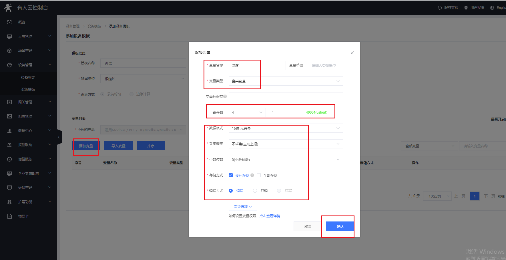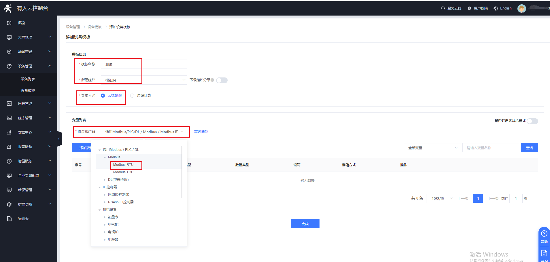 3.設備管理——設備模板,添加模板,選擇云端輪詢,modbus rtu協議,測試從機地址為1,寄存器為40001,選擇不采集,主動上報,配置完確認,完成。