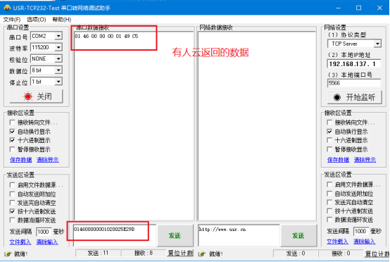 模擬測試:串口調試助手——虛擬串口——有人云——數據顯示