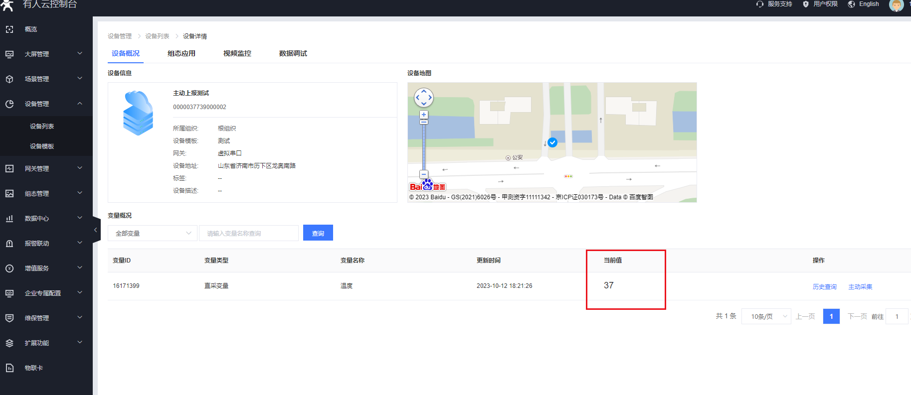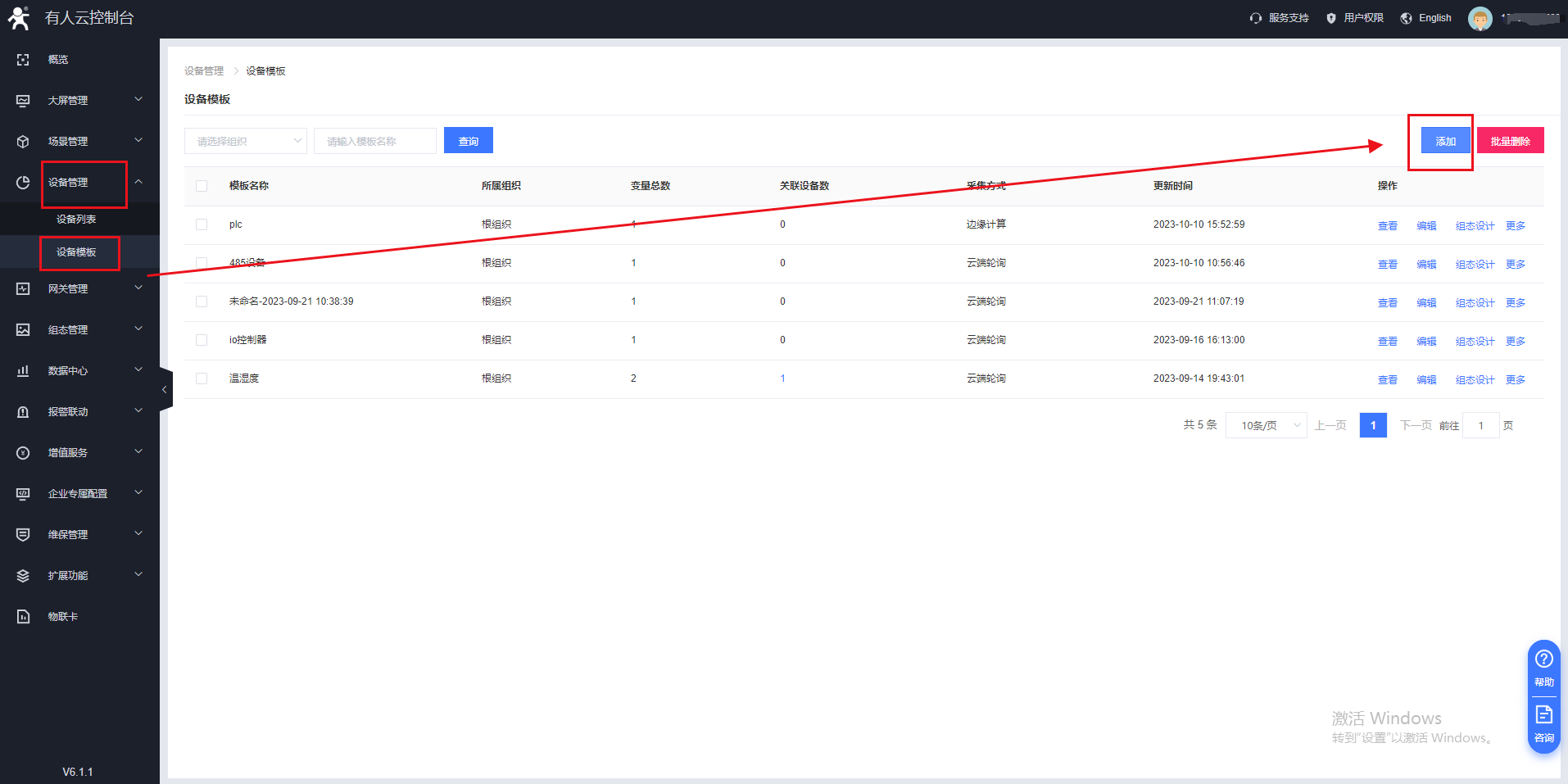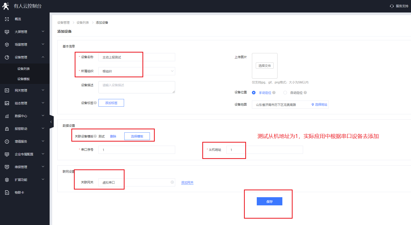 4、設備管理——設備列表——添加設備,關聯添加的網關虛擬串口(實際應用中是DTU)和模板
