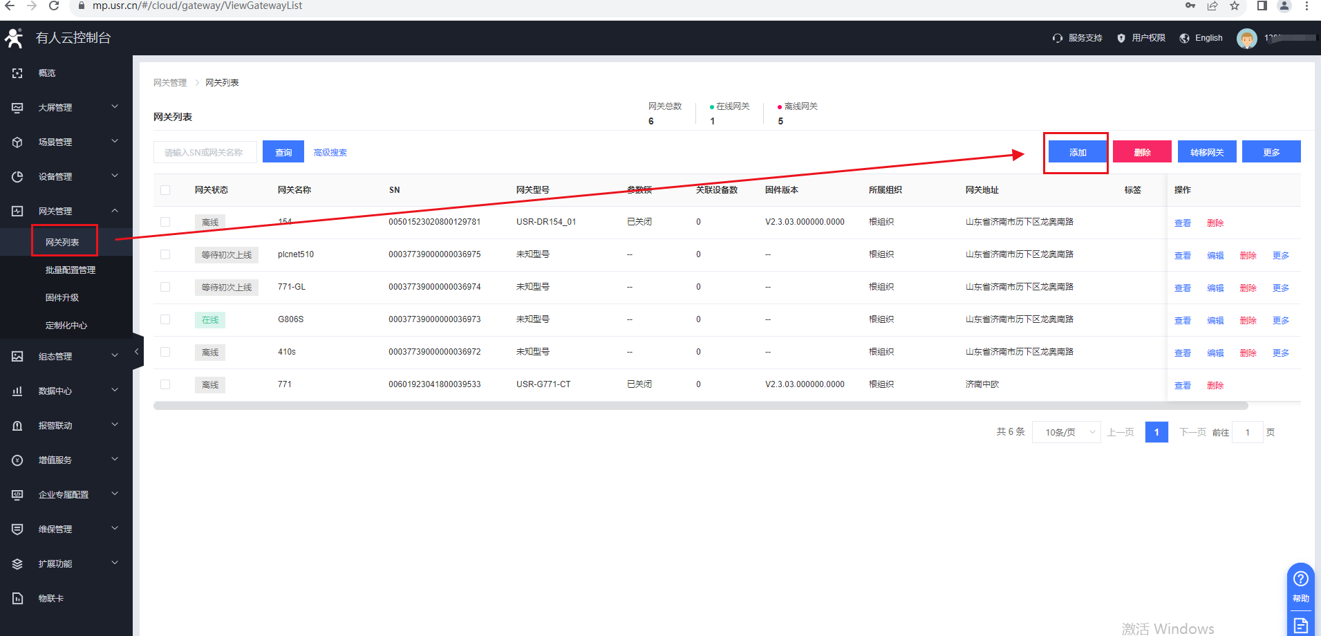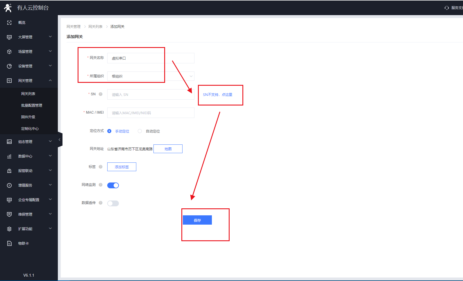 在網關管理——網關列表——添加網關,自定義設備名稱與項目分組——點擊sn不支持,點這里(特別注意)