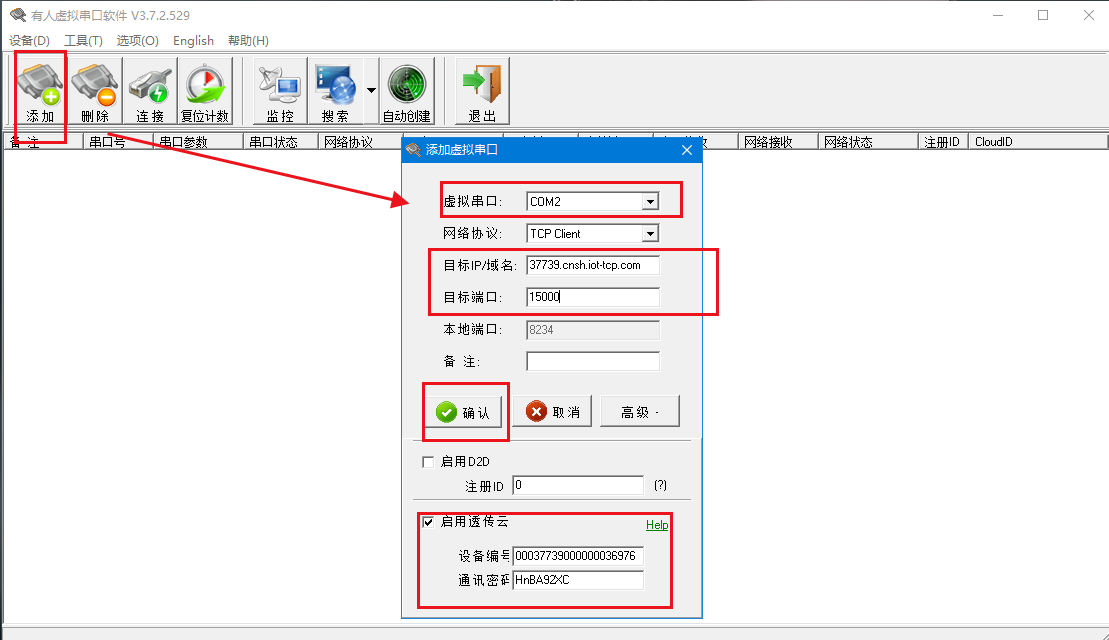 1、創建虛擬串口,連接云端添加網關生成的接入地址和端口,以及sn和密碼