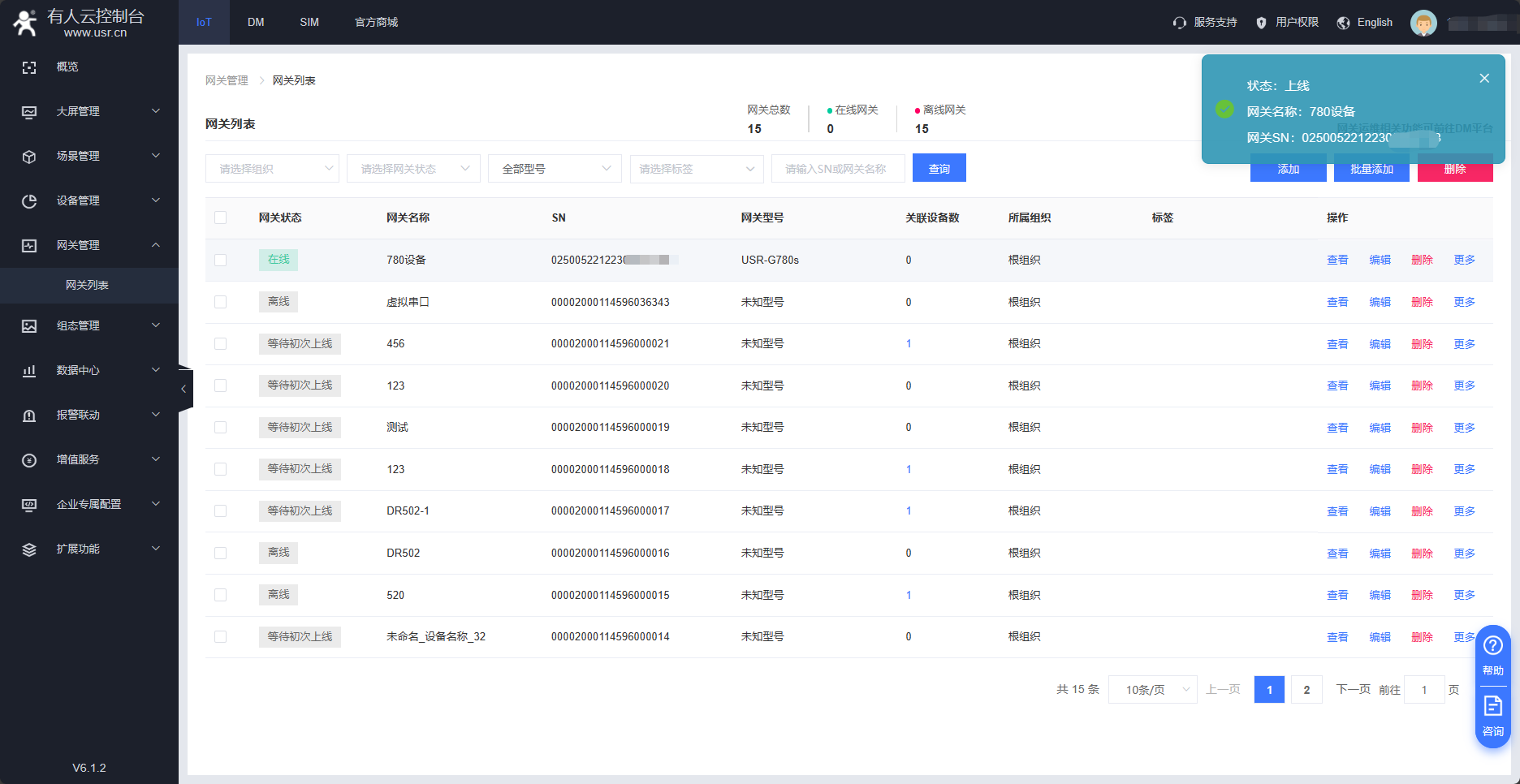 在網關管理---網關列表可以看到我們掃碼添加的G780s設備,如果設備目前處于離線狀態,可以檢查一下設備自身是否可以正常聯網。在設備正常聯網狀態下可以重啟下設備,可以看到設備的在線信息。