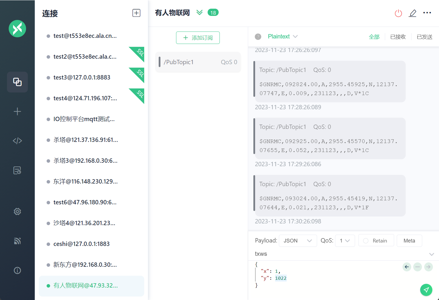 設備鏈接GPS天線可以放在室外空曠位置,在MQTT.X查看定位數據。