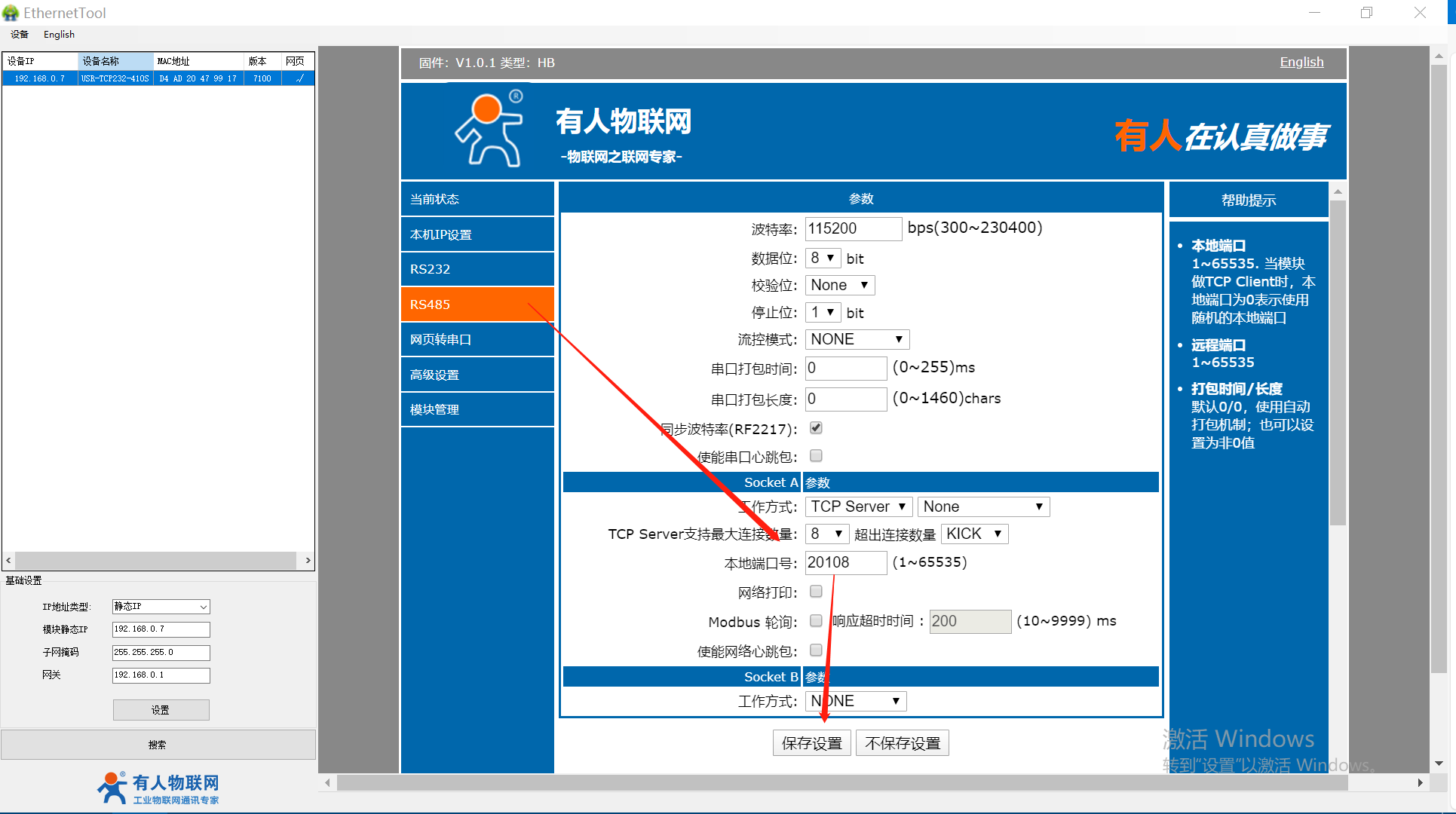 6、在配置軟件上設(shè)置成tcp sever 本地端口號設(shè)置成20108,保存并重啟。如需改串口參數(shù)可在此界面更改