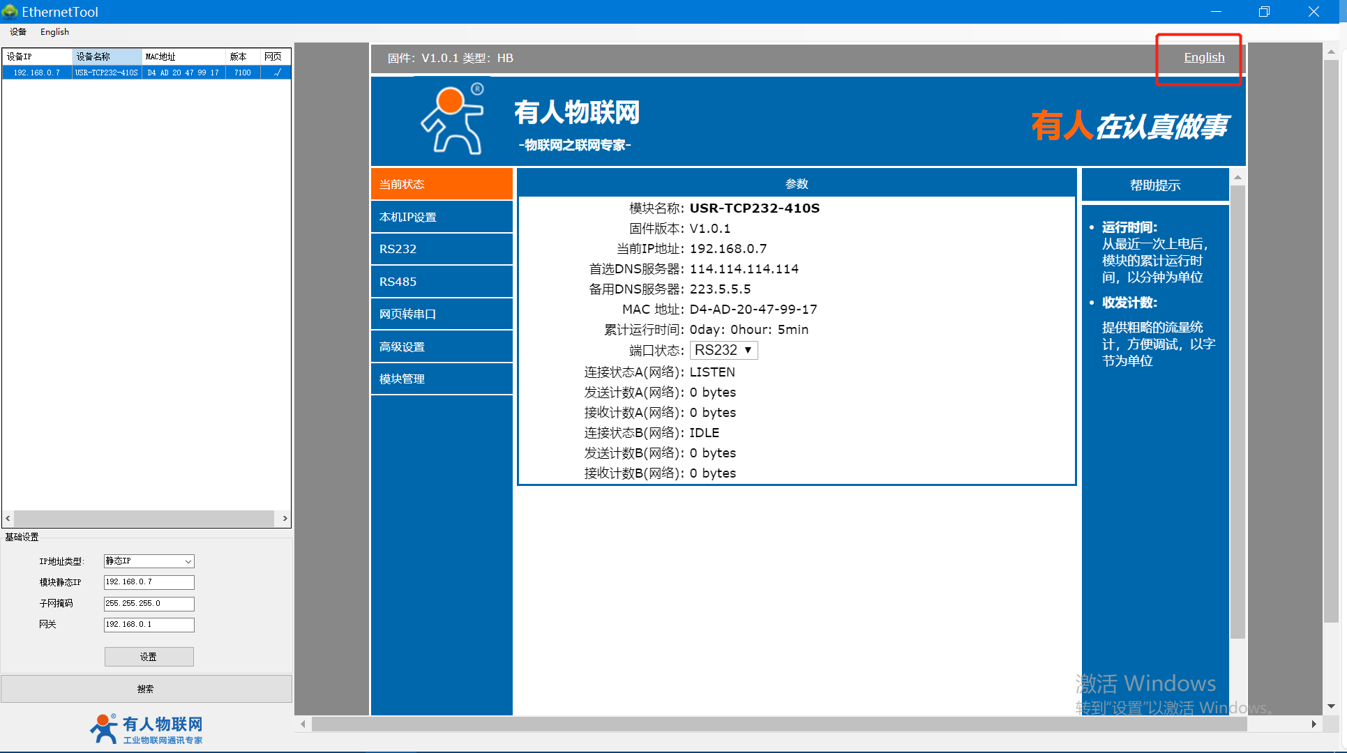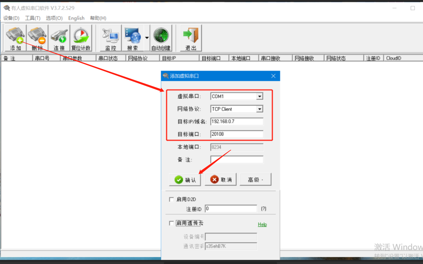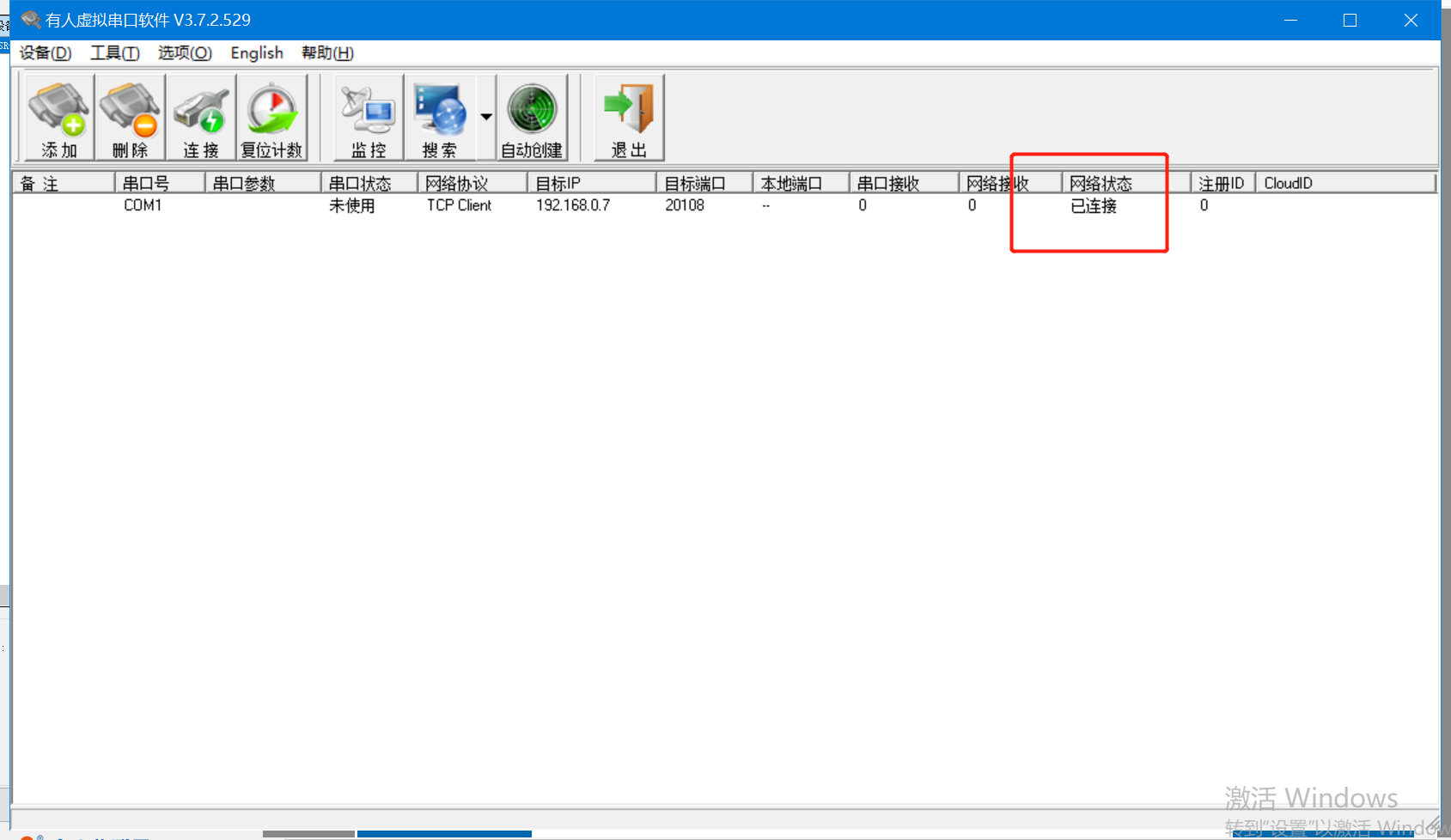 5、打開虛擬串口軟件,建立虛擬串口,設(shè)置為tcp client,目標(biāo)IP為192.168.0.7 端口號為20108。