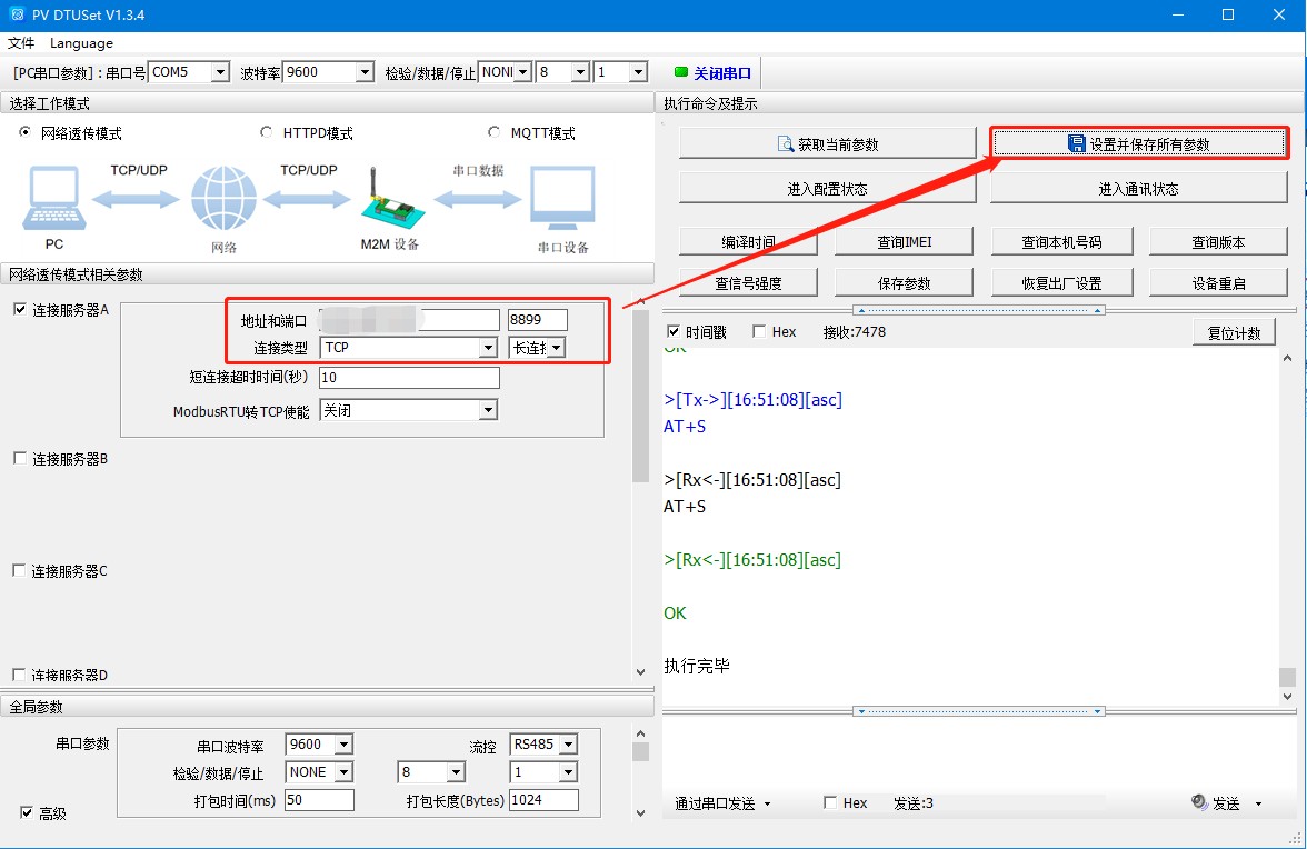 3.配置USR-S100連接遠程TCP服務器,將遠程服務器A參數修改為要連接服務器的IP和端口號,點擊設置并保存所有參數。