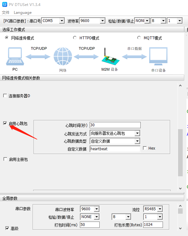 注意:設備默認是開啟心跳包功能的,若是不需要心跳包,可以配置不啟用心跳功能。