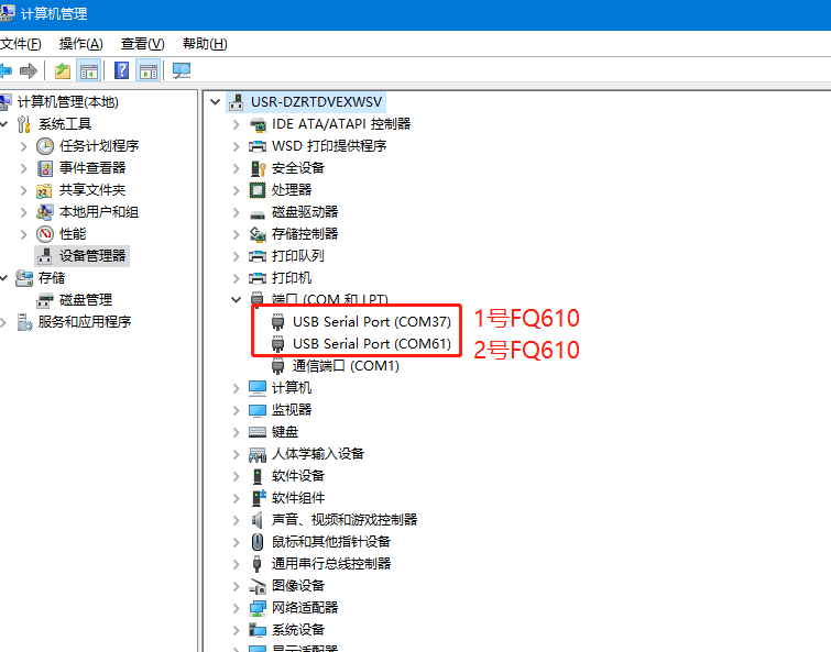 注意:電腦設備管理器中可以看到USB COM端口出現,電腦接usb串口后沒有出現COM端口,極大可能是電腦沒有該USB轉串口的驅動,可自行下載驅動精靈更新串口驅動。