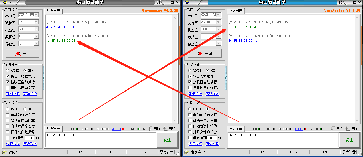設備的兩串口分別用串口軟件打開可以測試數據相互透傳。