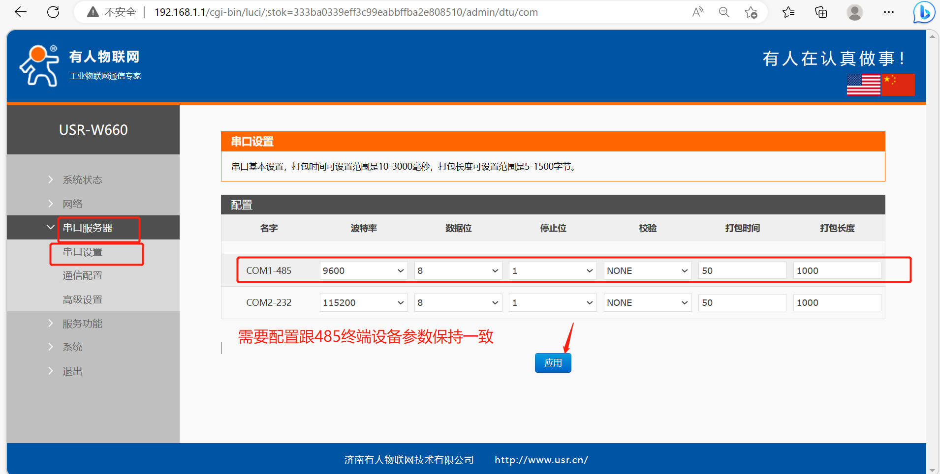 4、打開“串口服務器”---“串口配置”---配置串口參數與終端設備保持一致