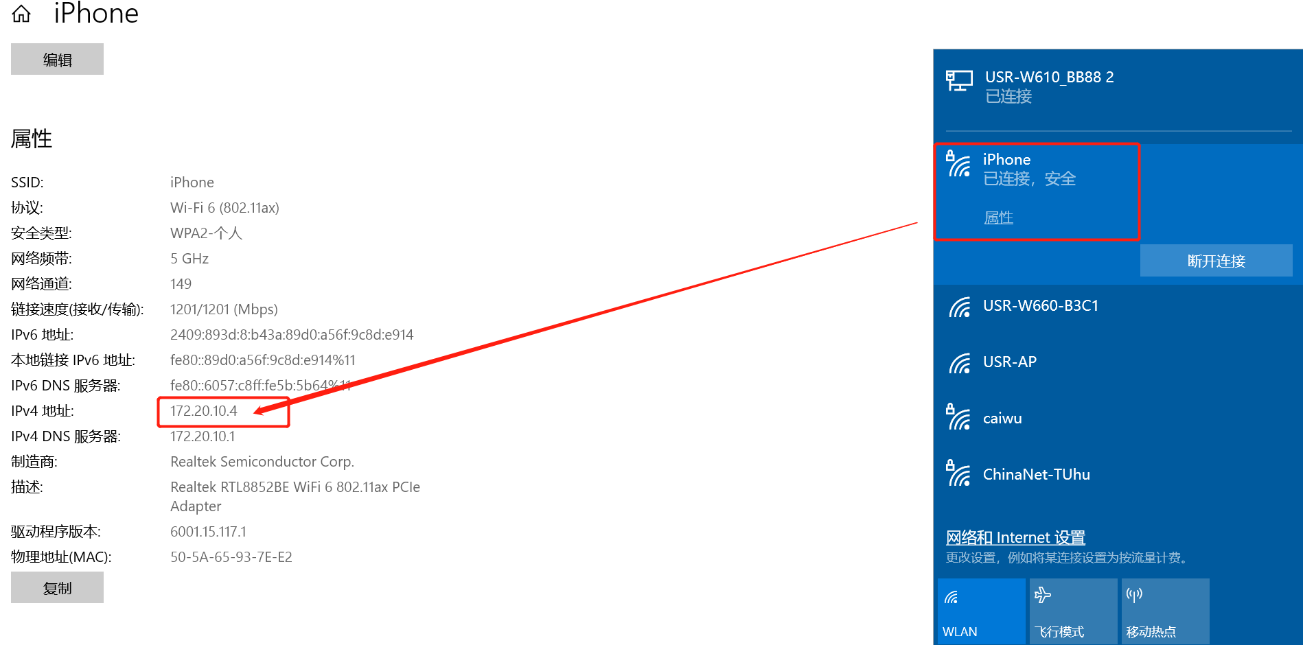 電腦也連接同一個APwifi后,獲取到跟W660在相同網段的1個ip;