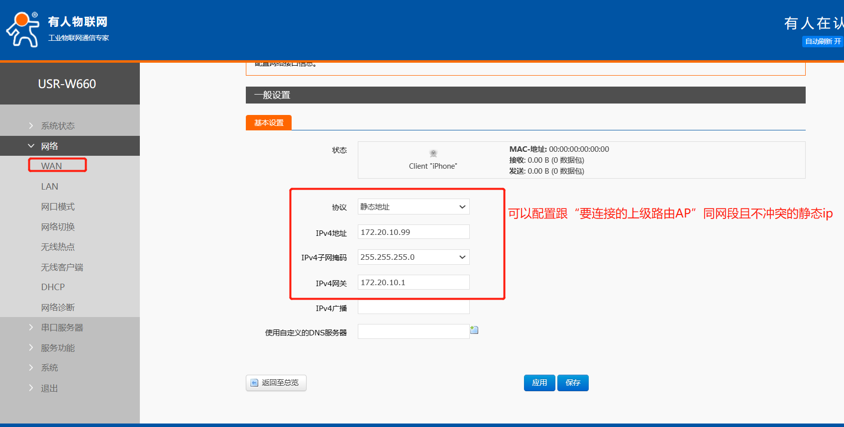 3、在“WAN接口”中,可以給W660配置一個靜態ip地址,注意要與上級路由AP在同網段的ip