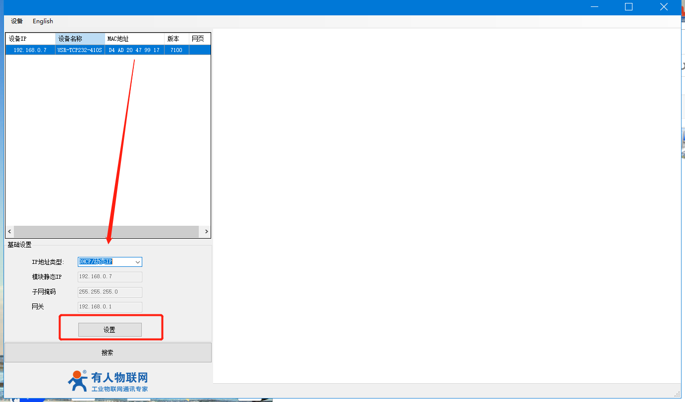 點擊“搜索設備”當搜索列表中出現410s的設備后,單擊搜索到的設備,查看以及修改其配置信息。IP地址類型更改為DHCP/動態IP,設置完成后通過網線將410s的網口接到路由器LAN口上面,給設備供網。