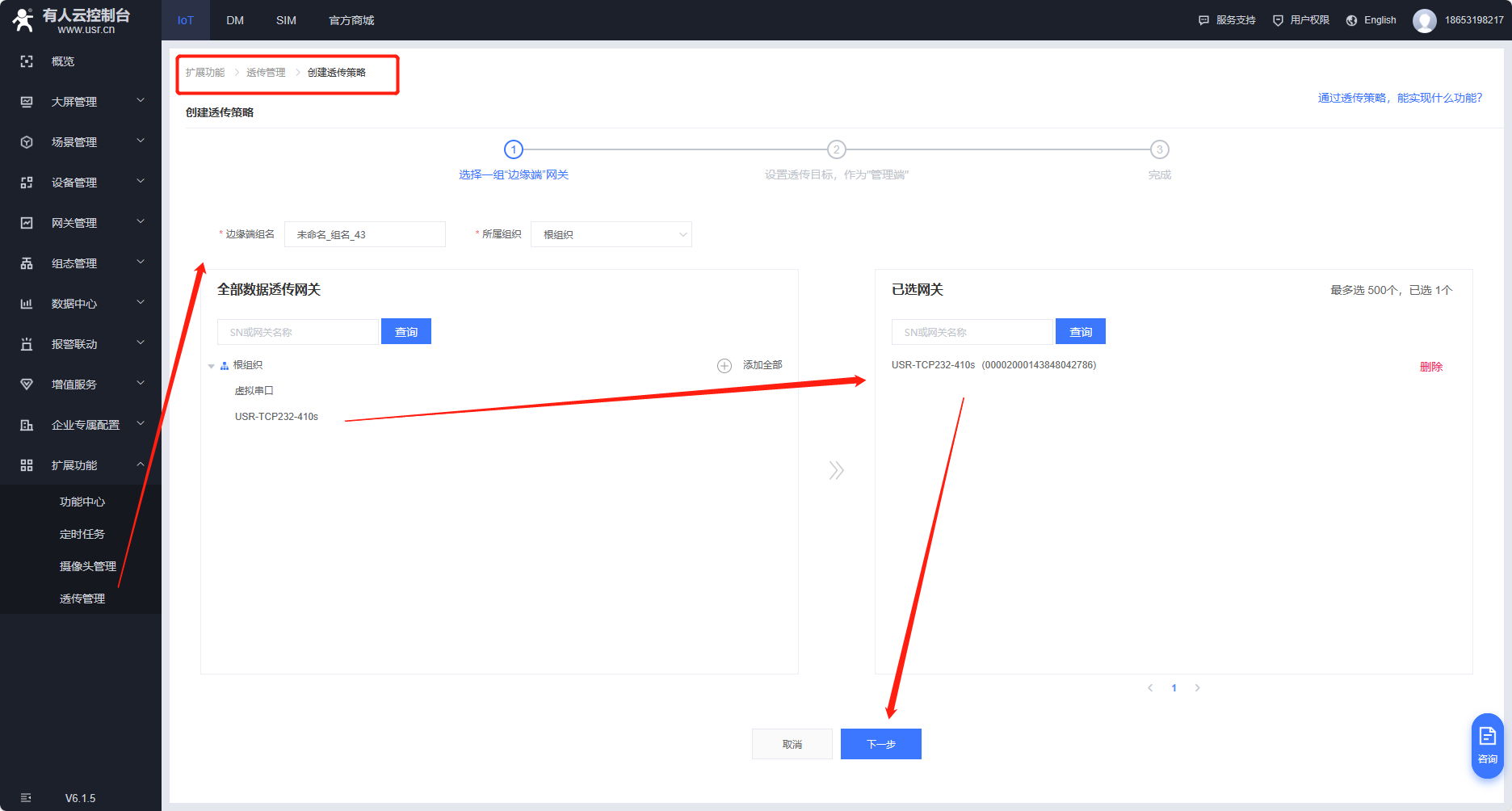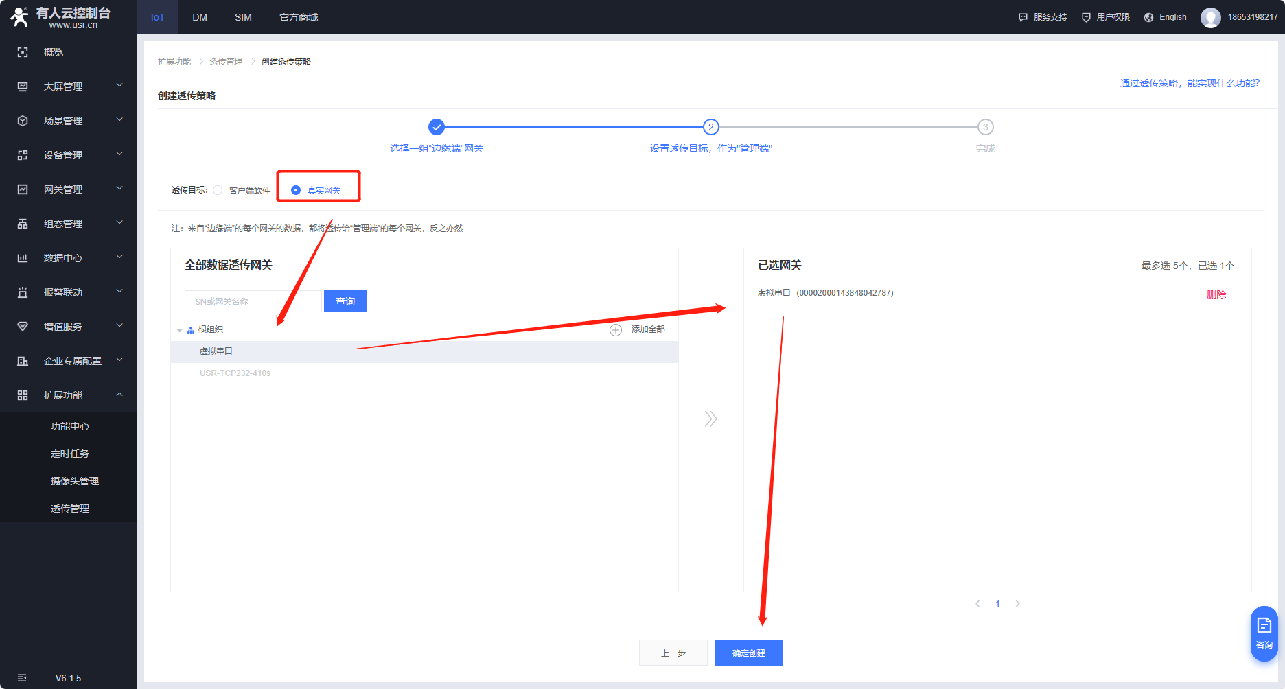 云平臺添加設備,在網關管理---網關列表--添加網關,點擊SN不支持,系統自動生成,不需要自己設置,打開數據透傳開關,通訊密碼可以自定義8位密碼.(建議使用系統自動生成的通訊密碼) 勾選有人云透傳。
