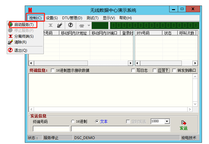 6、無線數據中心演示系統發送信息區,對終端號碼0001,發送1234567890,WH-LTE-7S4 V2連接的串口助手,接收到數據1234567890。