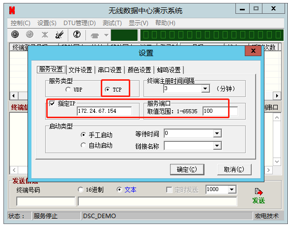 2、點擊設置,點擊服務設置,服務類型勾選TCP,勾選指定IP,輸入遠程服務器對應的服務器IP,服務端口用100,點擊確定。