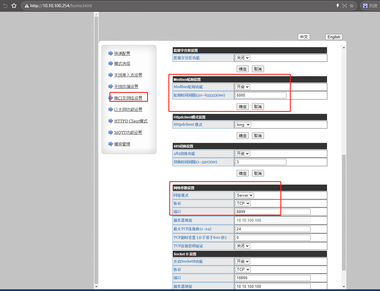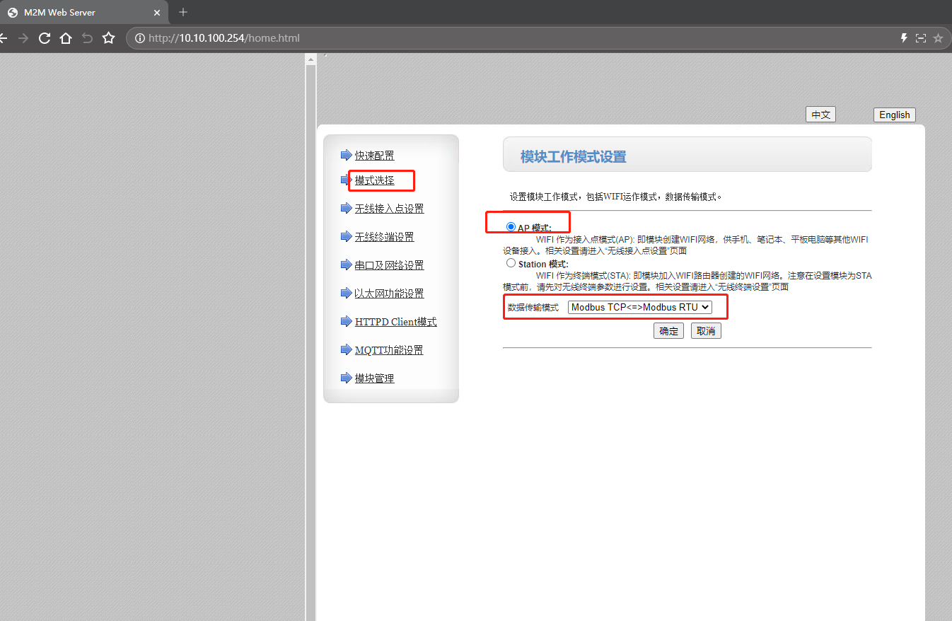 網(wǎng)頁上設置AP模式,開啟MODBUS TCP轉(zhuǎn)MODBUS RTU模式,點擊確定。