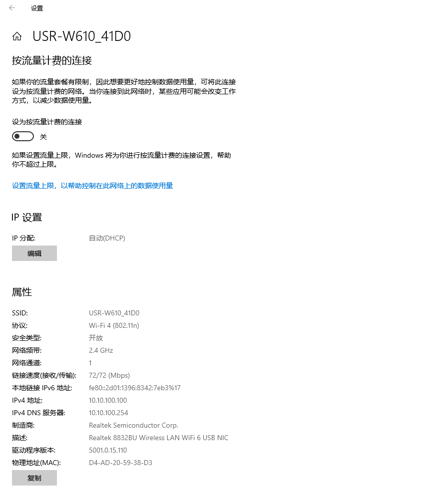 USR-W610默認是AP模式,電腦連接USR-W610的wifi。