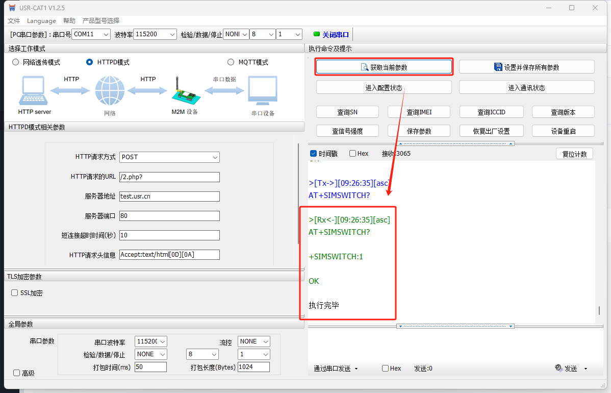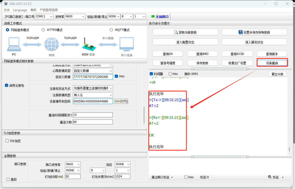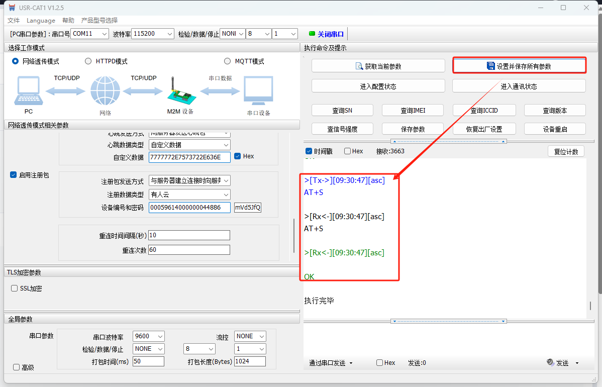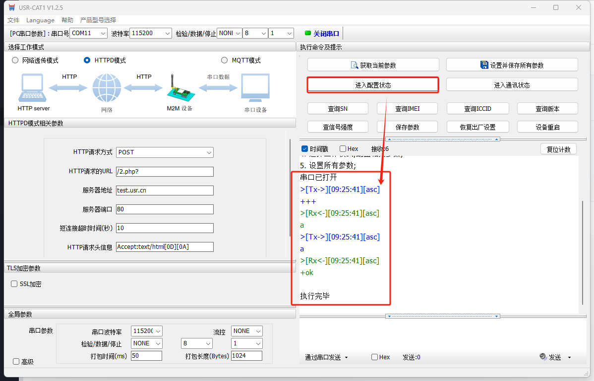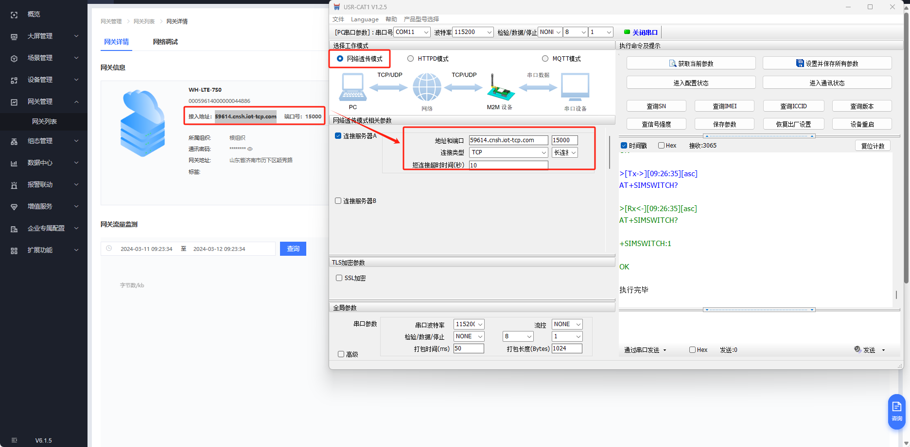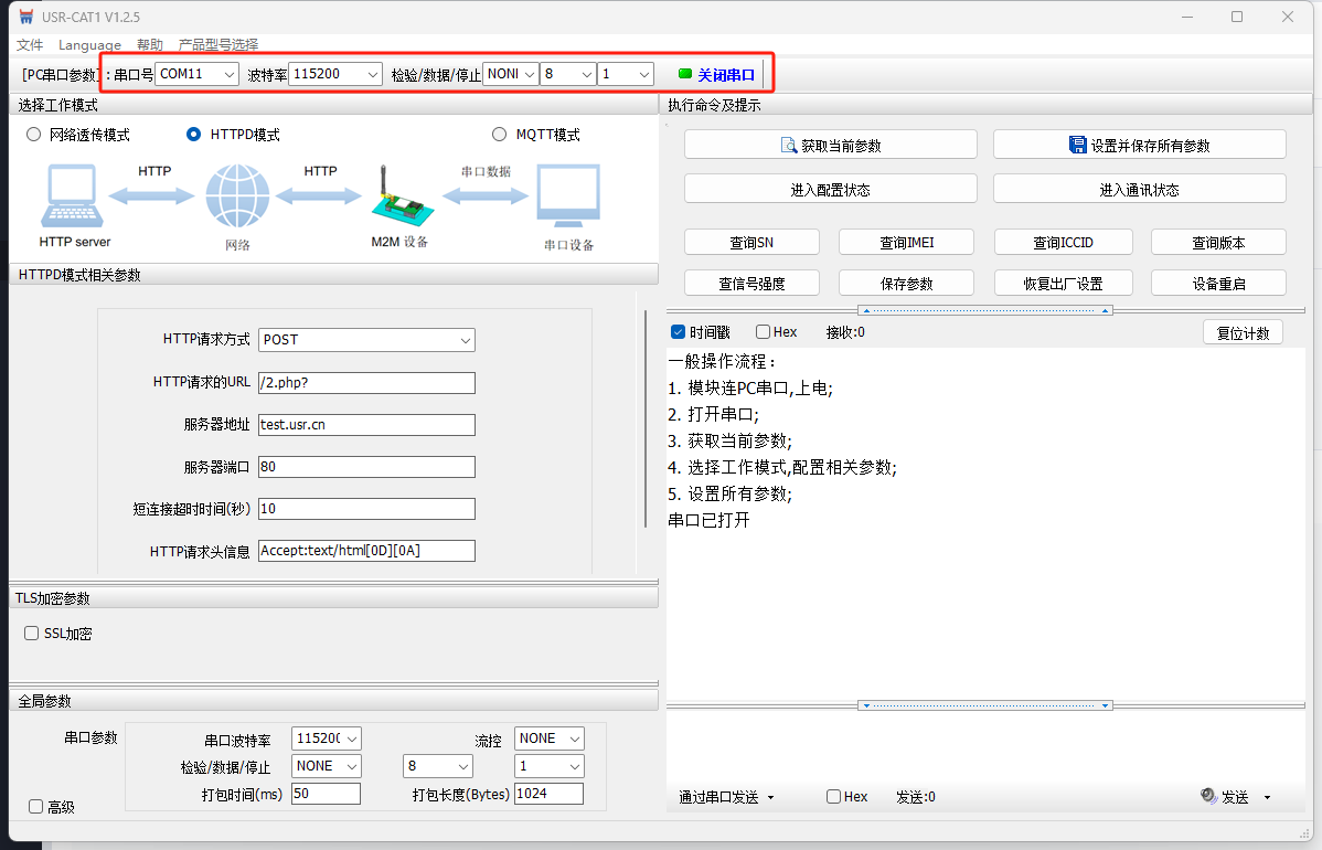 打開WH-LTE-7S0上位機軟件,選擇COM11,115200 NONE 8 1,打開串口。