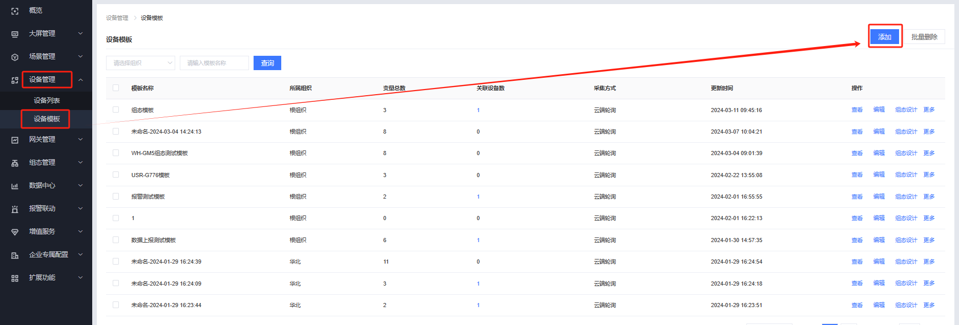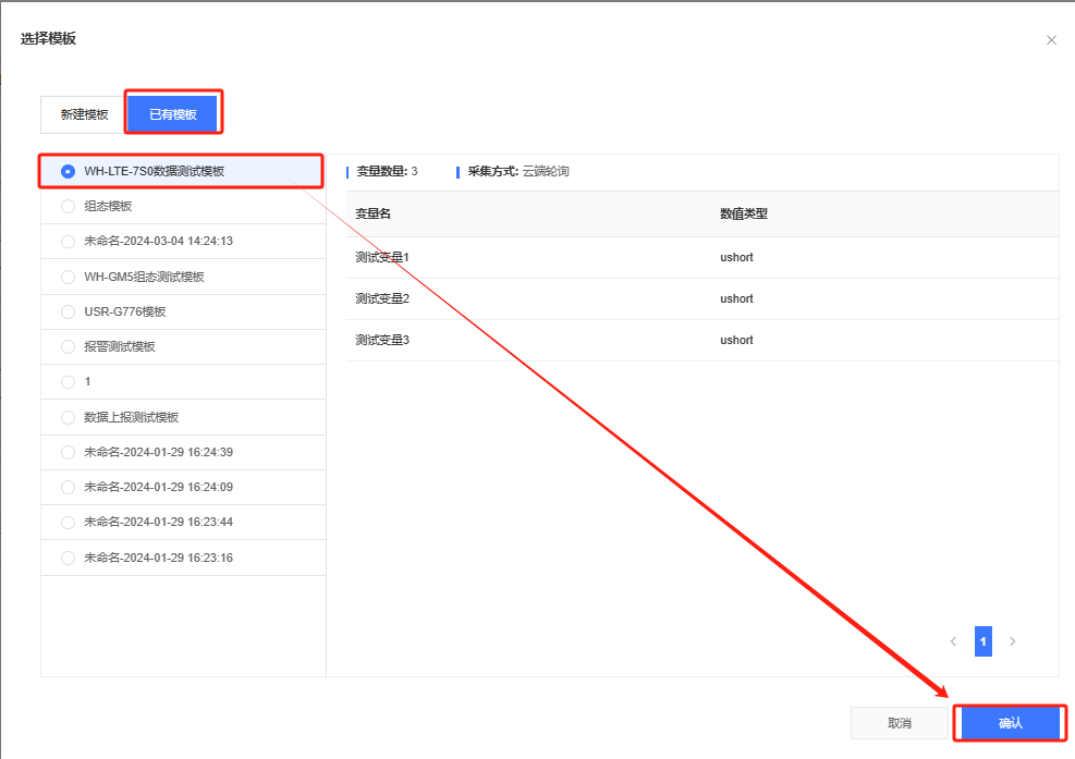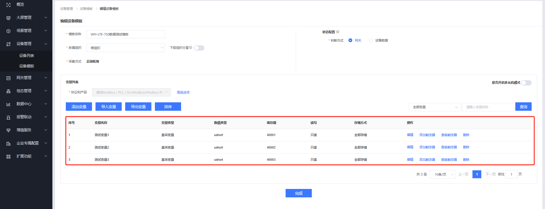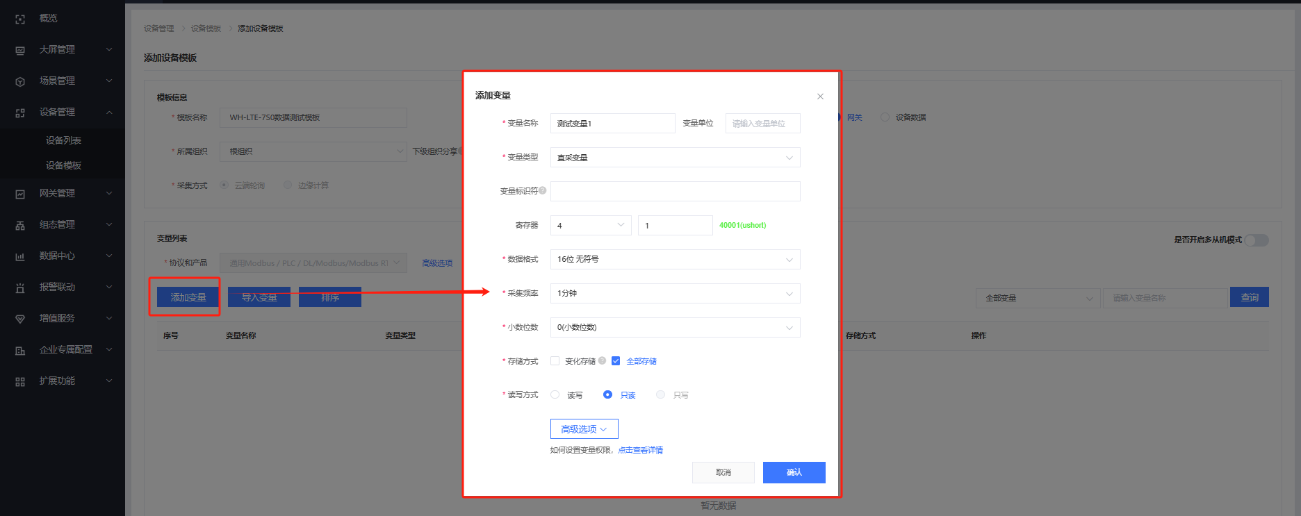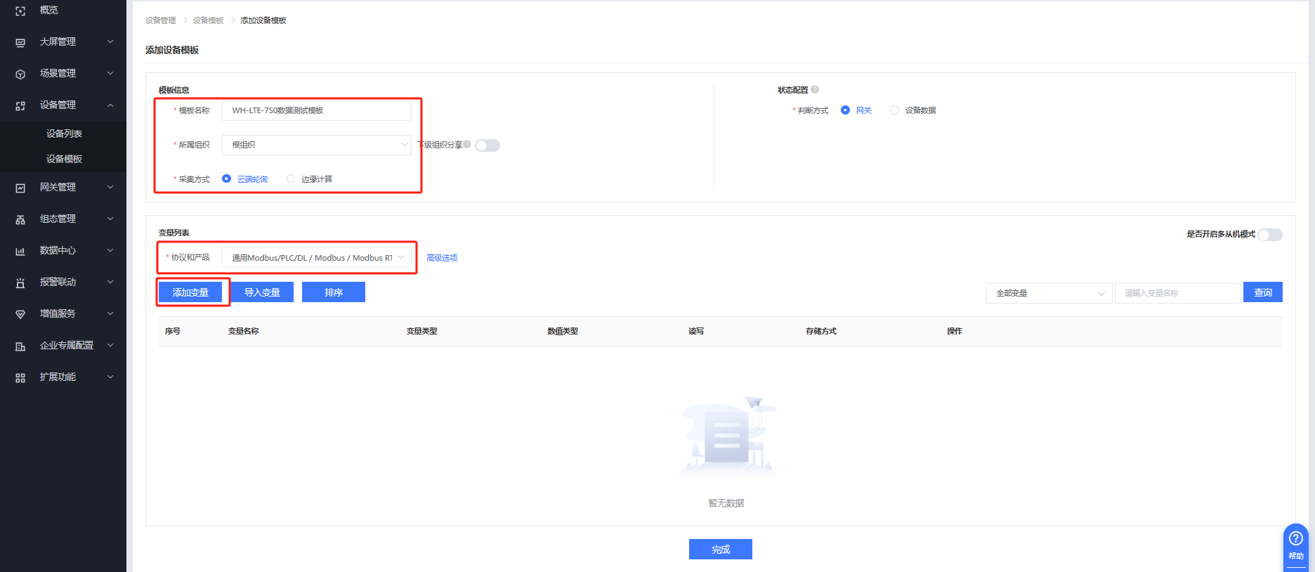 填入模板名稱,選擇根組織,采集方式選擇云端輪詢,協議選擇通用Modbus/PLC/DL / Modbus / Modbus RTU,點擊添加變量