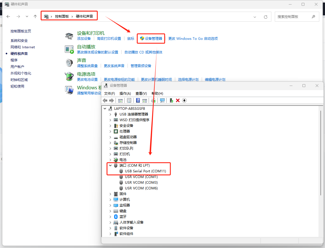 打開電腦控制控制面板---硬件和聲音---設備管理器---COM和LPT,確認COM口為COM11。