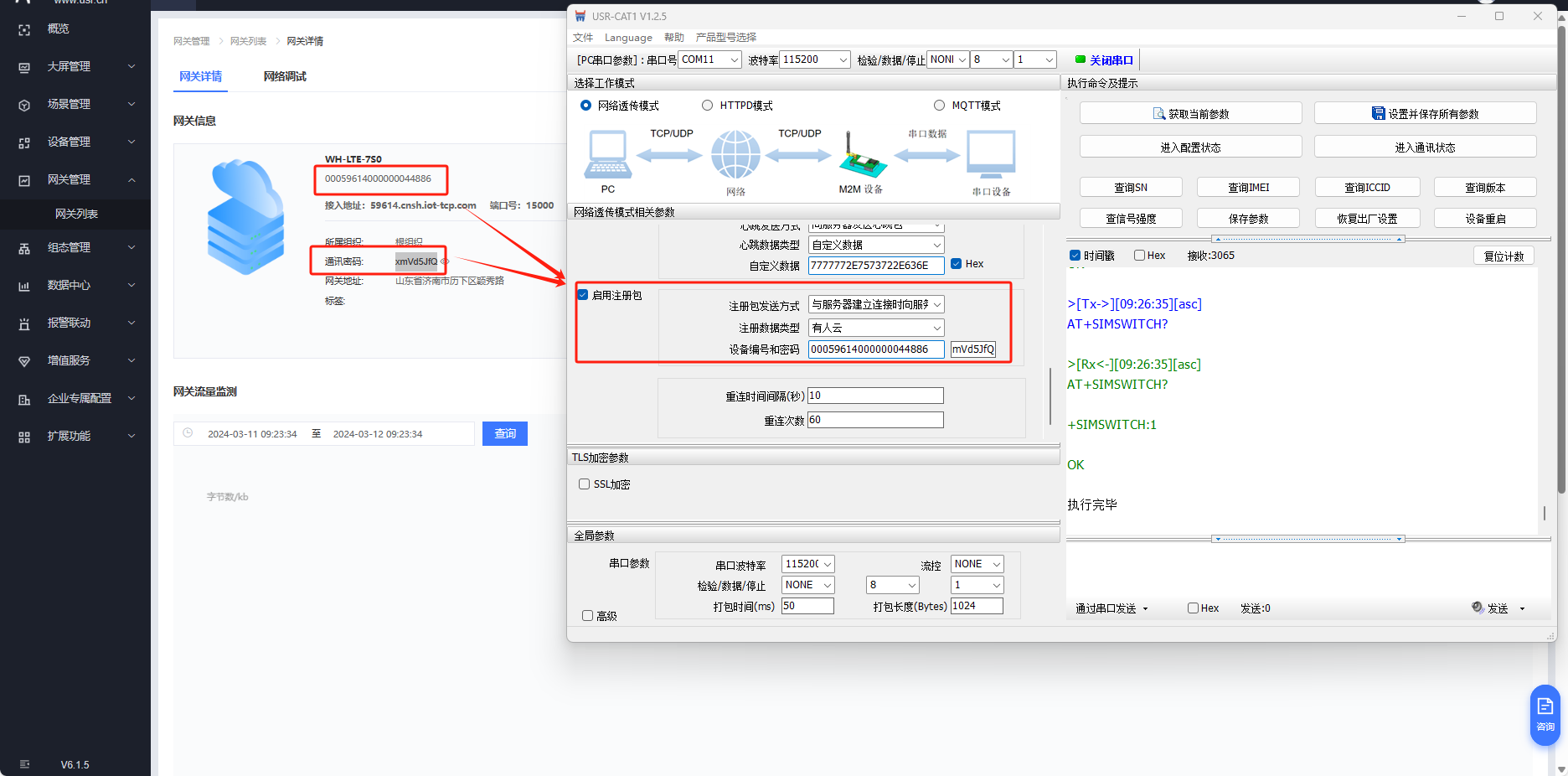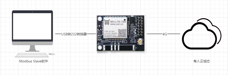 WH-LTE-7S0底板的232串口接USB-RS232串口線到電腦USB口,然后產品接12V電源適配器上線。
