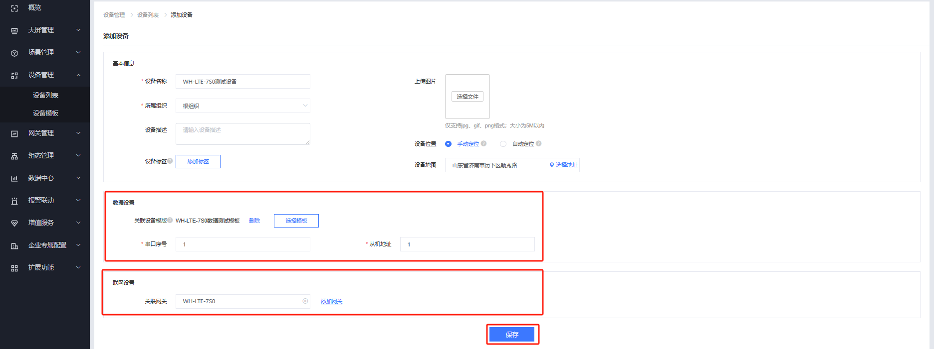 網關管理---網關列表,點擊網關名字,將有人云分配的接入地址和ID密碼填入WH-LTE-7S0中。