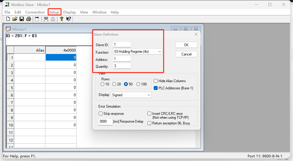 打開Modbus Slave 軟件,選擇COM11,填入WH-LTE-7S0的參數 9600 none 8 1,點擊OK