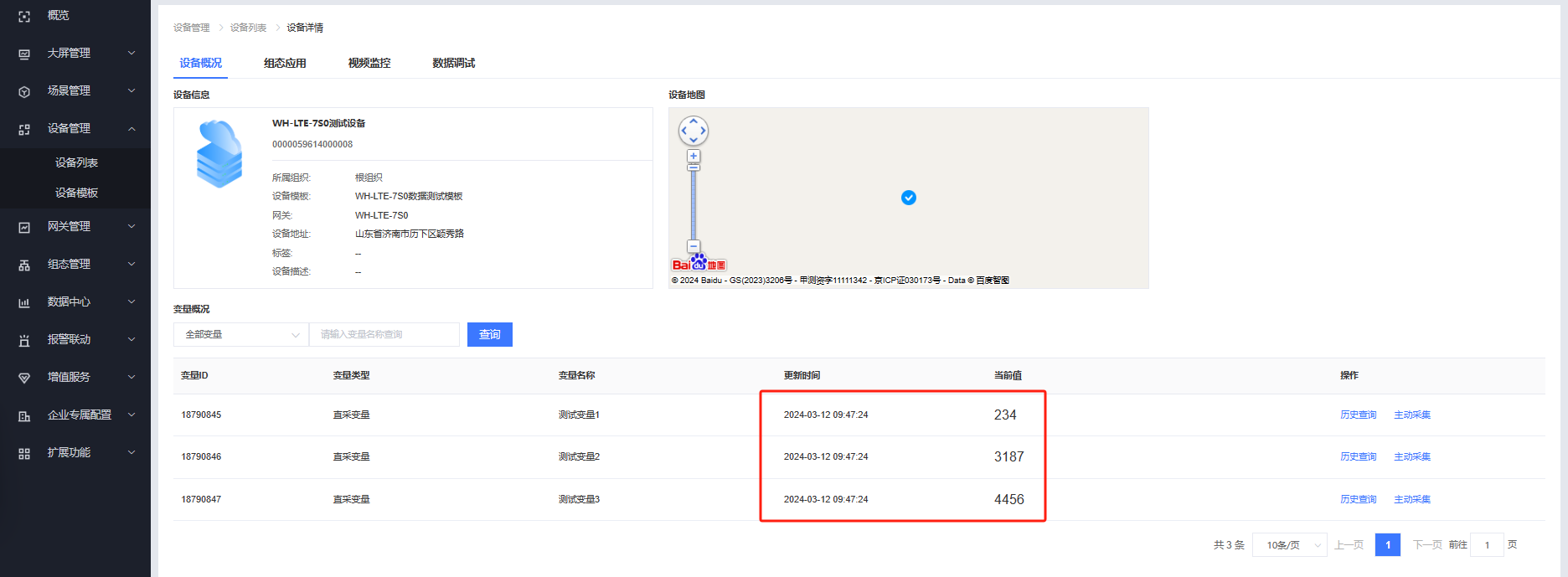在modbus slave 軟件中填入三個數據,即可在有人云端查看到相應的數據